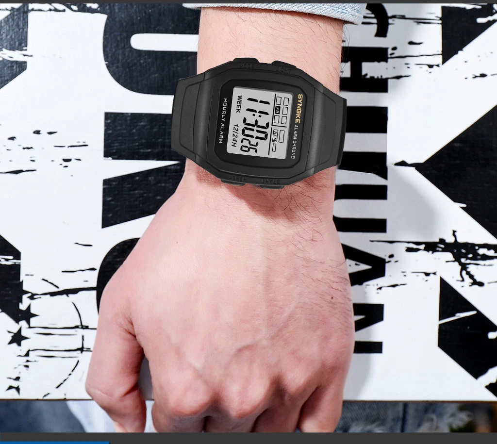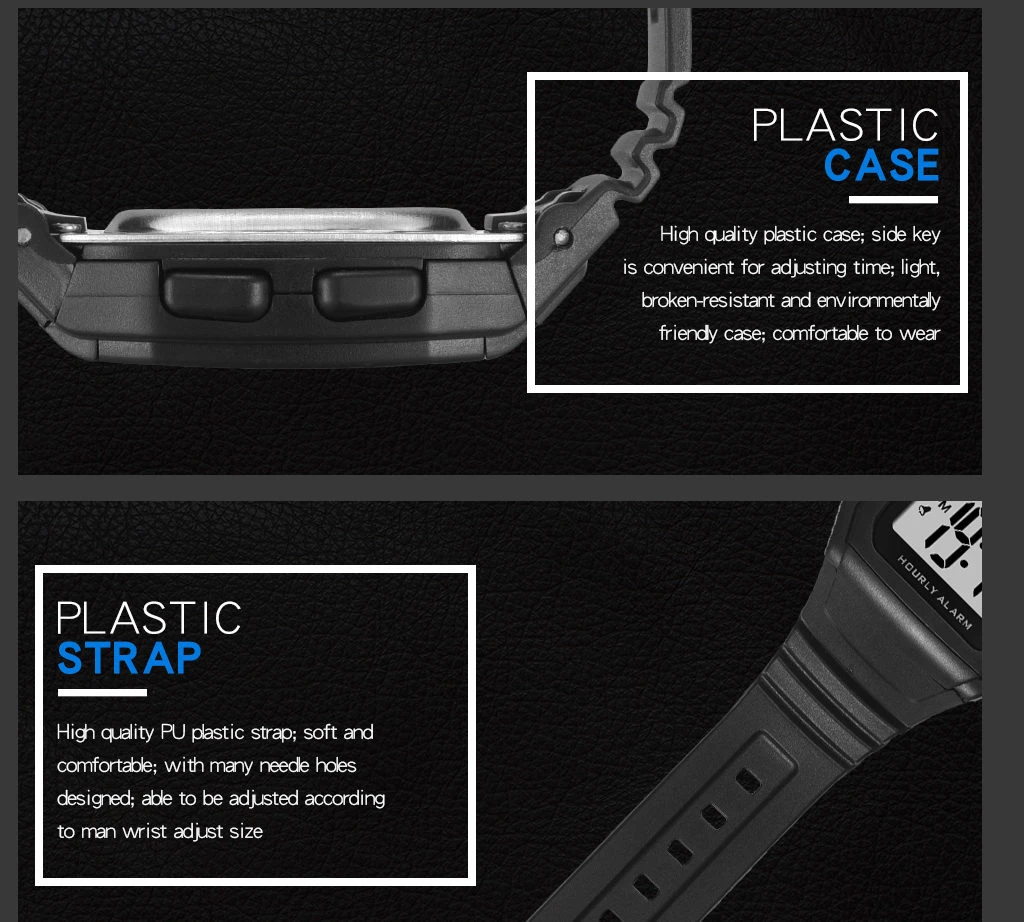 PU пластиковый ремешок, пластиковый чехол, нижняя крышка из нержавеющей стали, акриловое зеркало, Пряжка из нержавеющей стали.