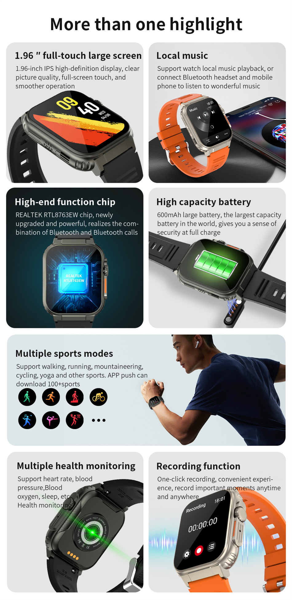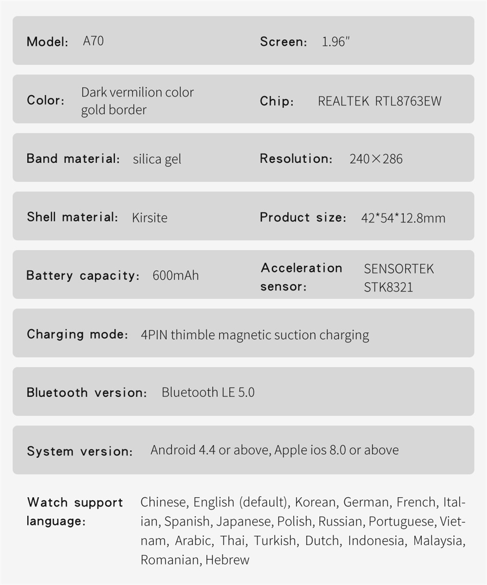 Основные характеристики: частота сердечных сокращений, артериальное давление, кислород в крови, датчик температуры, шагомер/калории, мониторинг сна, напоминание о будильнике, секундомер, 100 + спортивный режим, напоминание о сидячем положении, входящий звонок/смс, напоминание о сообщениях, обмен информацией о здоровье, вызов Bluetooth, телефонная книга, регулировка яркости браслета, дистанционное управление музыкой, напоминание о входящем звонке, уведомление о синхронизации, варианты набора 12 + 1, будильник, браслет для пробуждения, пульт дистанционного управления камерой, музыка Bluetooth, режим не беспокоить, пользовательское лицо, панель набора номера, набор Siri, Поиск телефона, поиск браслета, переключатель набора номера, расстояние, Поддержка переключения языков и т. д.