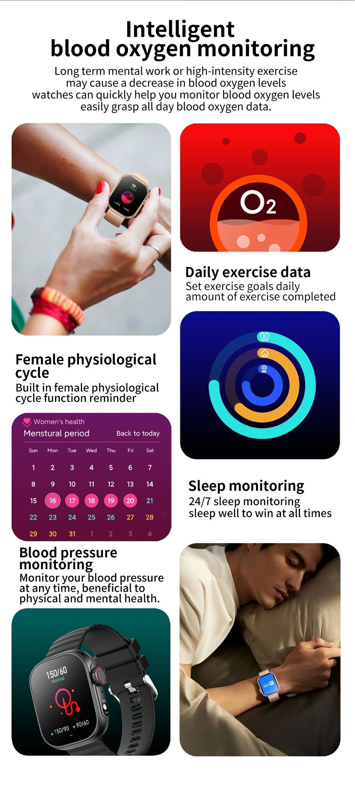 1. Здоровье: 24/7 монитор сердечного ритма, датчик кислорода в крови, трекер сна, дыхание, напоминание о питье воды, напоминание о движении, физиологический цикл женщин, приложение для поддержки здоровья.