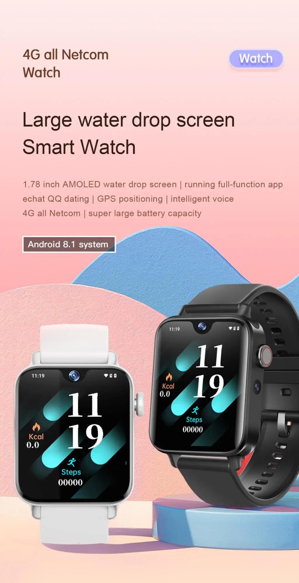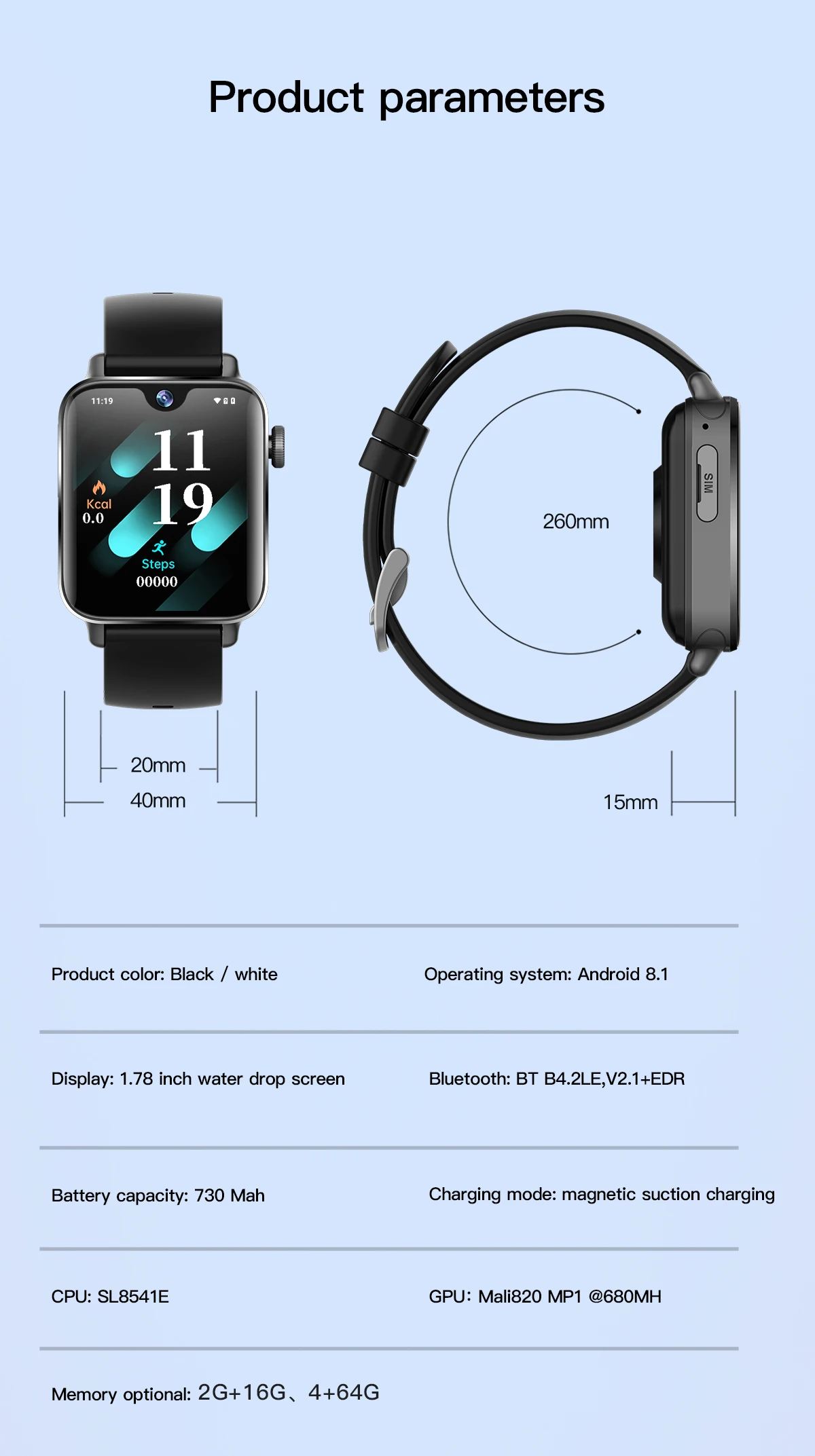 1. Операционная система: Android8.1. 2. Тип процессора: SL8541E, четырехъядерный процессор ARM CortexTM A53 МП процессор, до 1,4 ГГц. 3.GPU:Mali 820 MP1 @ 680MH. 4.WiFi + Bluetooth + FM три в одном: поддержка. 5. Расположение: поддержка GPS / Beidou / GRANAS, WiFi 2,4G/5G, поддержка BT. 6.SIM: поддержка. 7. Дисплей: 1,78 дюймовый AMOLED квадратный экран (368*448). 8. Сенсорная панель: поддержка. 9,2G Сеть: GSM B2/B3/B5/B8,3Gnetwork:WCDMA: B1/B2/B5/B8,4Gnetwork:LTE_FDD: b1/B2/B3/B5/B7/B8/B20 LTE-TDD:B38/39/40/41(100 МГц). 10. Антенна: Внешняя LDS. 11. Приемник: независимый наушник/динамик (2 в 1). 12. Двигатель: поддержка. 13.bluetooth:BT4.2. 14. Датчик G: поддержка.