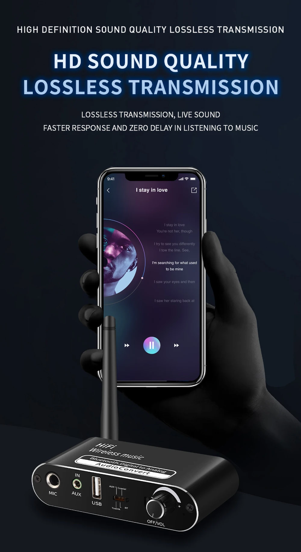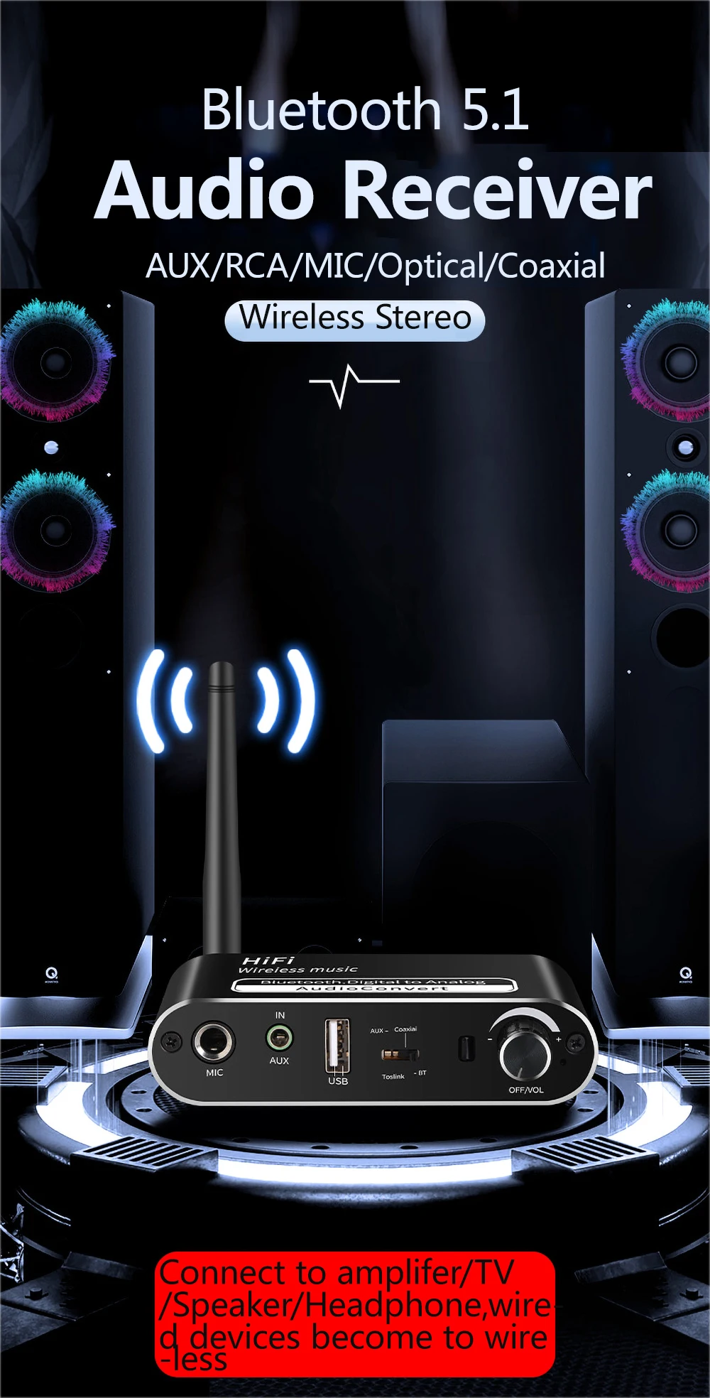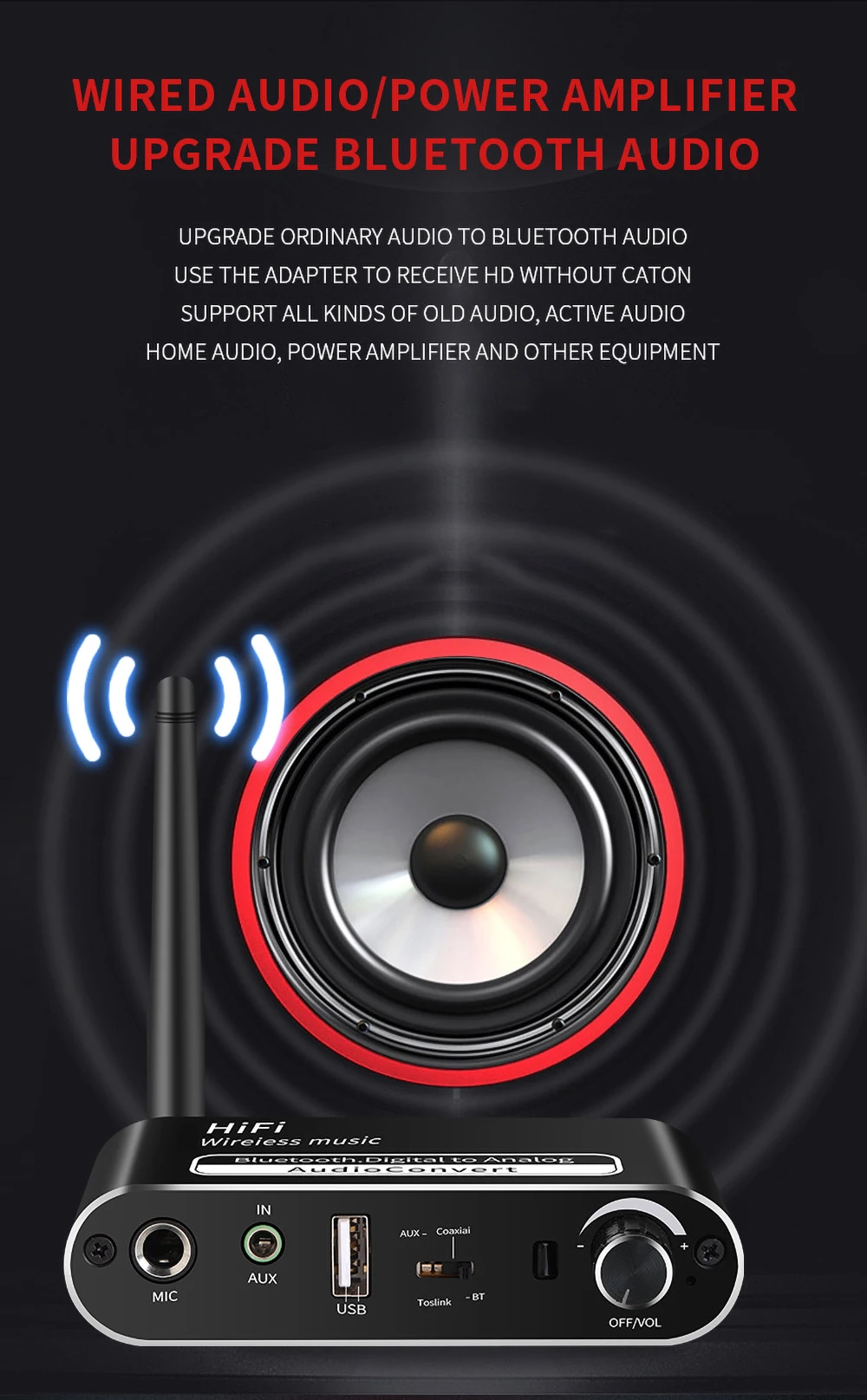 Этот продукт представляет собой адаптер аудиоприемника Bluetooth 5,1, который передает аудио высочайшего качества по беспроводной сети с телефона/планшета в любую домашнюю стереосистему. С Bluetooth,Aux,Toslink, коаксиальным, RCA, u-дисковым входом и выходом через RCA или Aux, различные интерфейсы для удовлетворения всех ежедневных аудио конверсий.