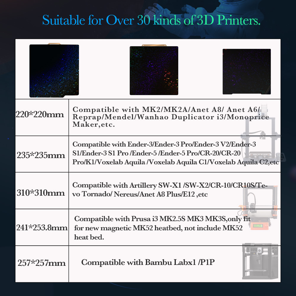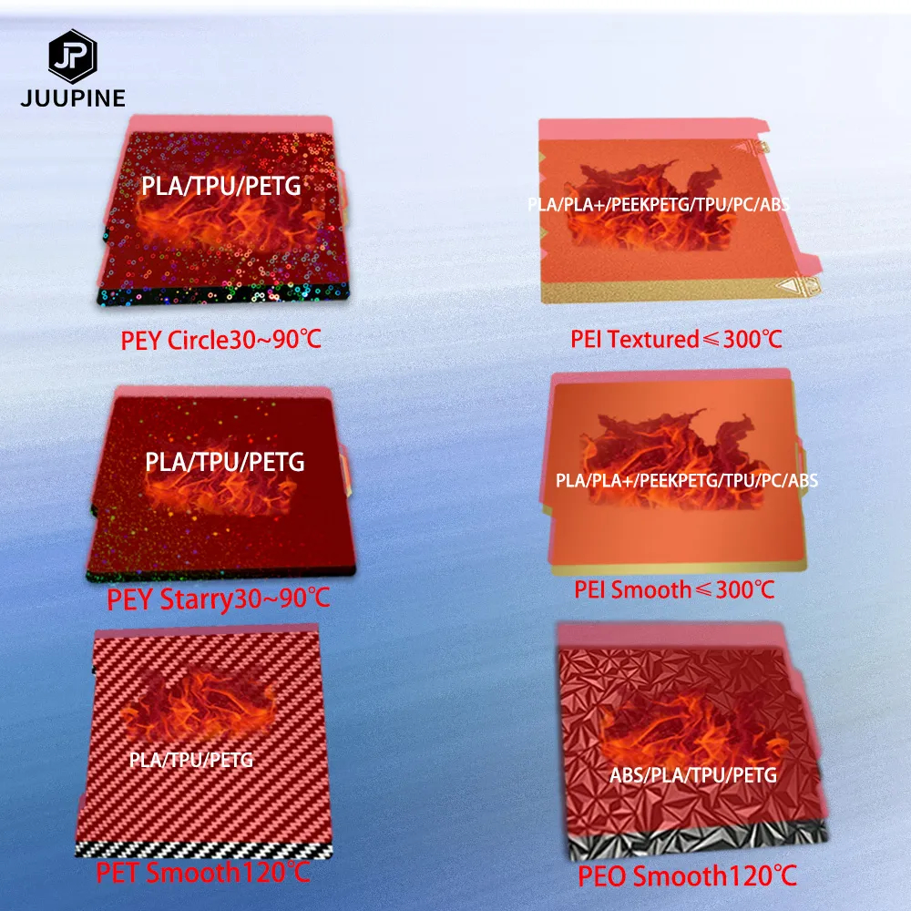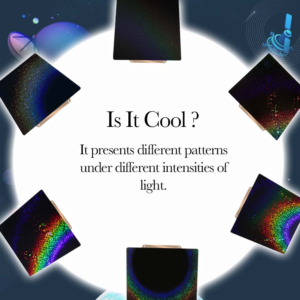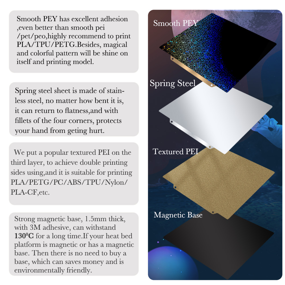 Пленка PEY настолько отличается от других пленок, что на ней есть узор из звезд и маленьких точек, которые будут ярко светить, и когда вы смотрите на нее под разными углами, будут отражены разные цвета, так красиво. Поверьте мне, когда вы получите его, вы должны быть шокированы и любить его. PET/PEO также имеет выкройку на модели, Но супер PEY может сделать вашу модель иметь красочные и крутые узоры напрямую. До сих пор мы напечатали почти 60 раз и не обнаружили никаких повреждений рисунка внутри пленки PEY. Его коэффициент повторного использования очень высок. Мы тестировали снова и обнаружили, что пленка PEY имеет очень хороший клей для нити, даже лучше, чем Гладкий PEI PET или PEO. Он даже может хорошо держаться, не нагревая платформу. Без клея, легко печатать даже для новичка Если поверхность PEY грязная, вам нужно только протереть ее влажной тканью, Высушите его сухой тканью, а затем он станет новым, как вы впервые его получаете, не требуется спирт или другой чистящий растворитель. Лист из пружинной стали можно согнуть, чтобы быстро удалить форму без помощи других инструментов. И пластина вернется к плоскостности, без деформации.