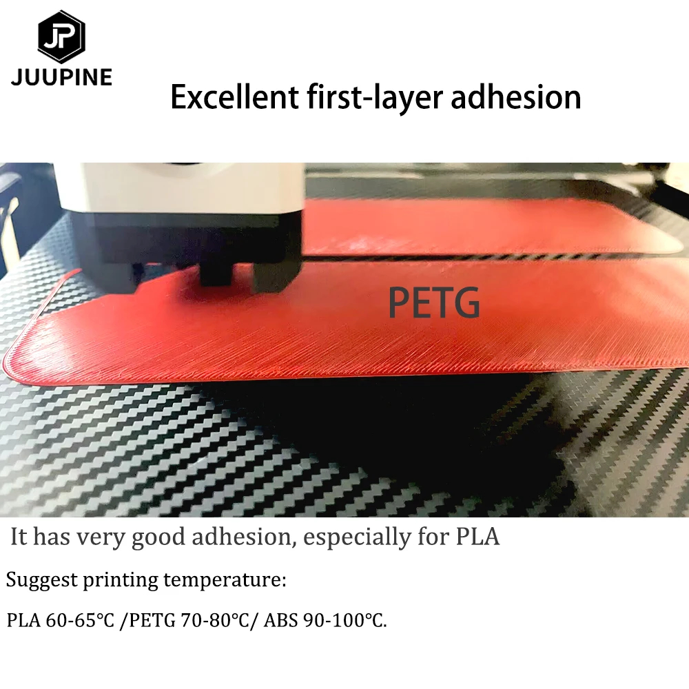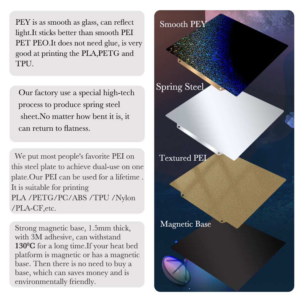 Печать PEI PLA /PLA-CF/PETG/PC/ABS /TPU/нейлон и т. Д. Лист пружинной стали имеет две стороны печати, вы можете печатать на PEY или PEI много раз, что позволяет вам в полной мере воспользоваться этим. 1. И PEY, и PEI имеют очень хорошую адгезию, особенно для PLA, поэтому первый слой легко напечатать даже для нового пользователя.