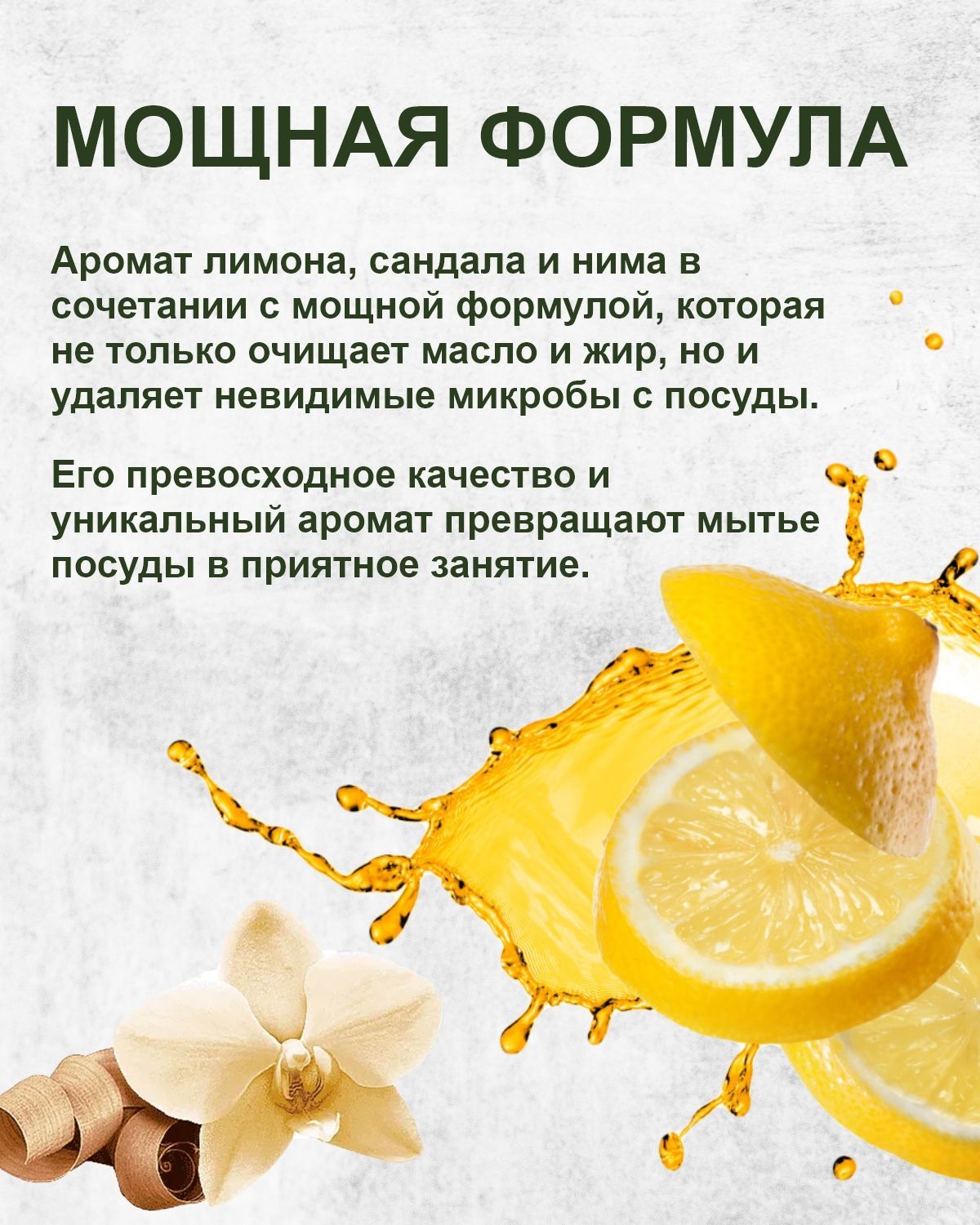 Описание: Аромат лимона, сандала и нима в сочетании с мощной формулой, которая не только очищает масло и жир, но и удаляет невидимые микробы с посуды. Его превосходное качество и уникальный аромат превращают мытье посуды в приятное занятие.
