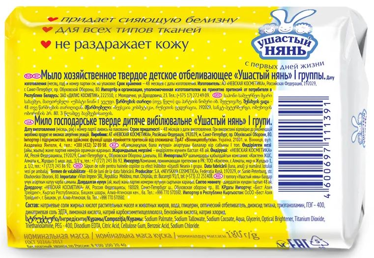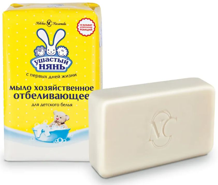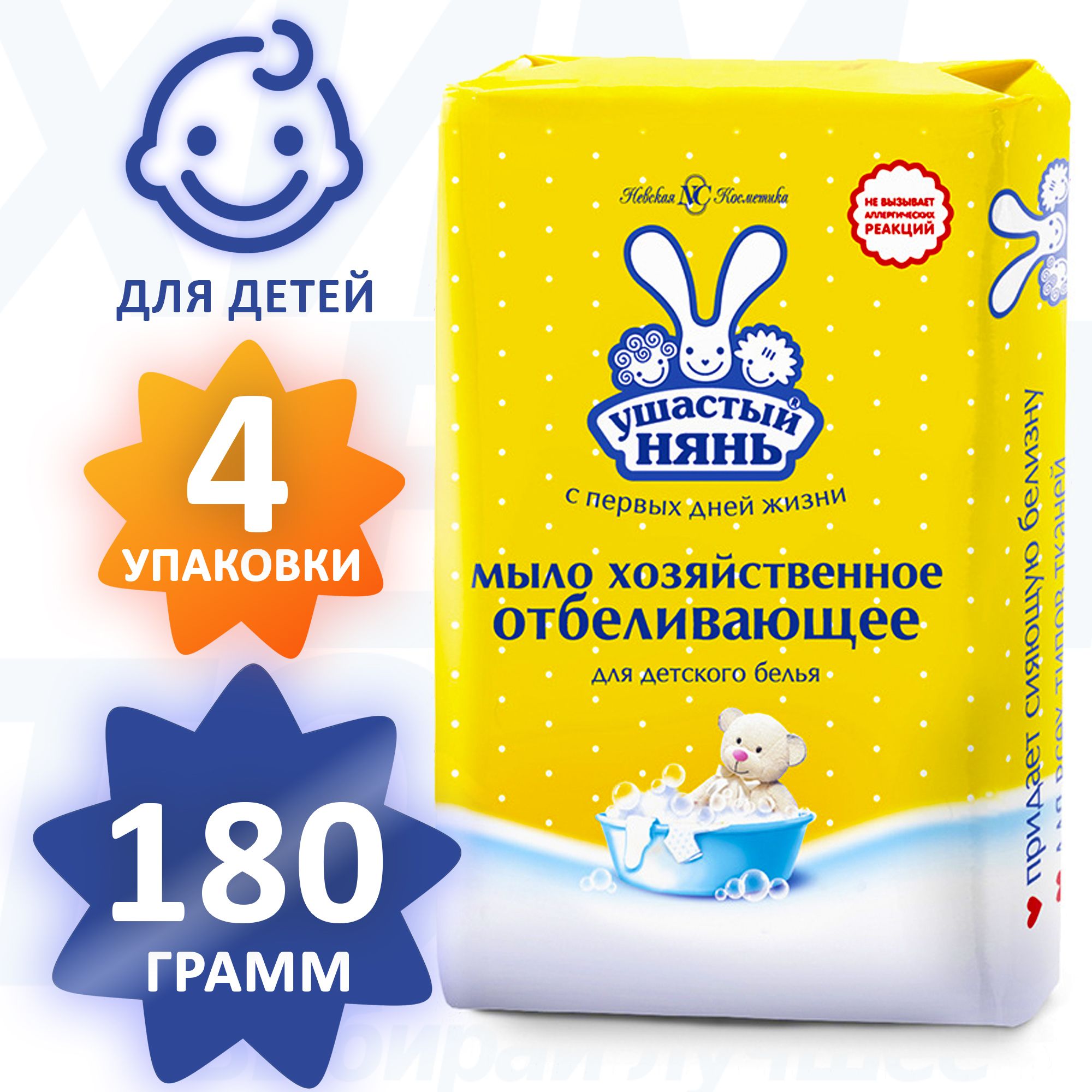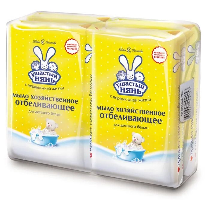 Мыло для стирки детского белья Ушастый Нянь отбеливающее, хозяйственное, гипоаллергенное, без отдушки, 180 грамм, 4 шт.