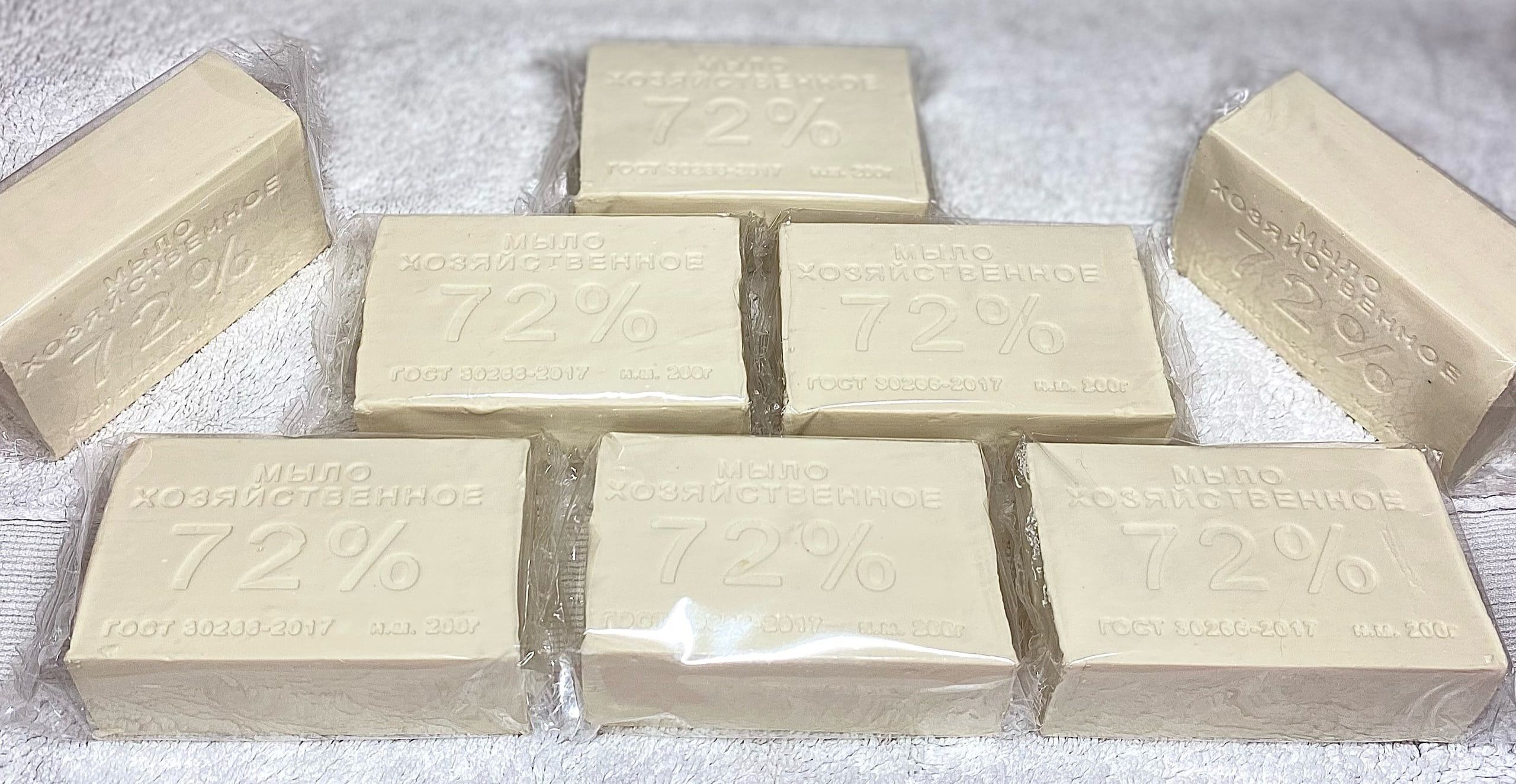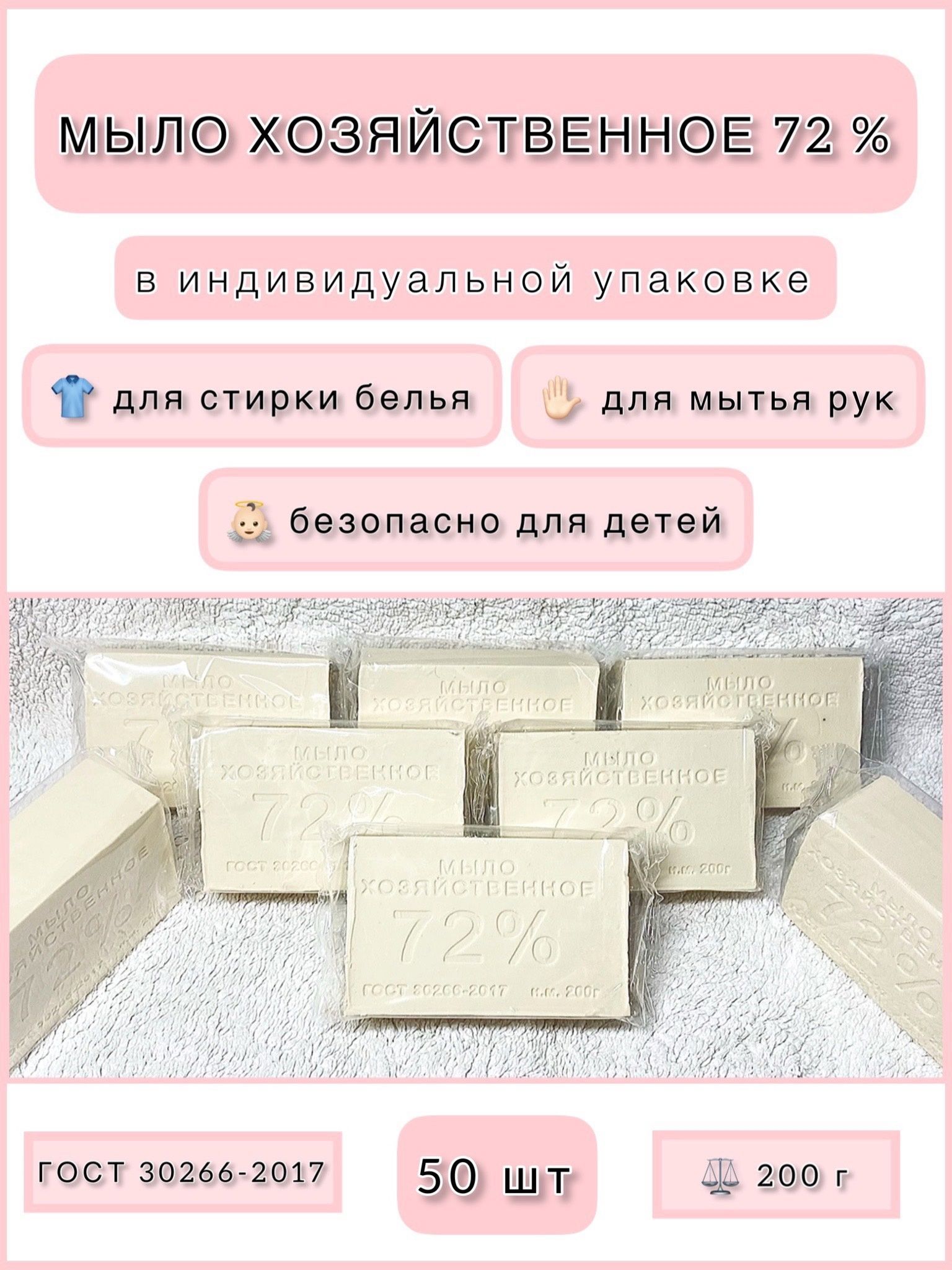 Мыло хозяйственное 72%, ГОСТ, натуральное твердое гипоаллергенное, 50 Штук по 200 г в обертке