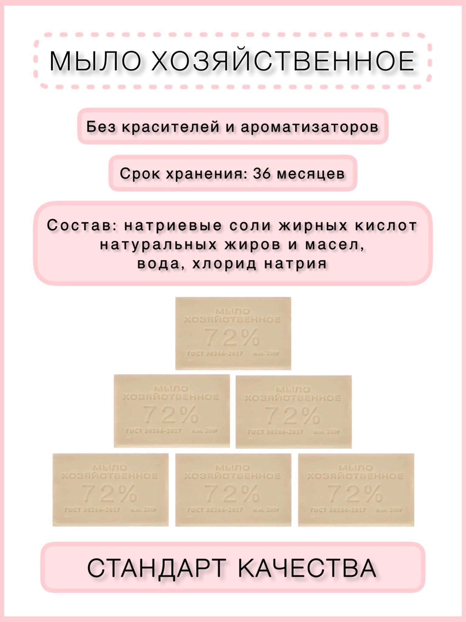 Произведено строго по ГОСТ 30266-2017. Имеет маркировку 72%, что означает, что мыло содержит не менее 72% жирных кислот. Чем выше этот показатель — тем лучше моющая способность мыла, тем эффективнее оно справляется со стиркой и отмыванием грязи.