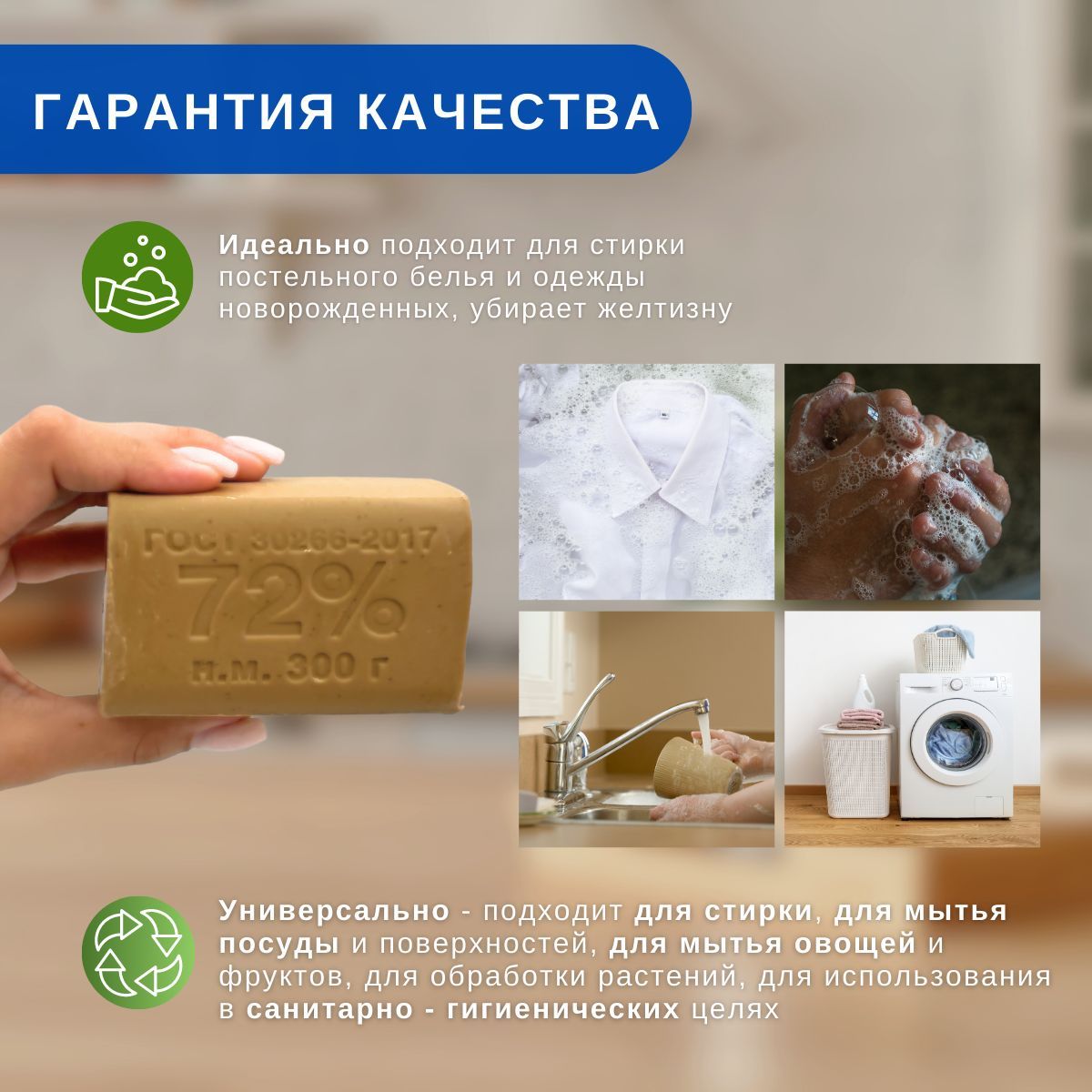 Универсально - подходит для стирки, для мытья посуды и поверхностей, для мытья овощей и фруктов, для обработки растений, для использования в санитарно - гигиенических целях;