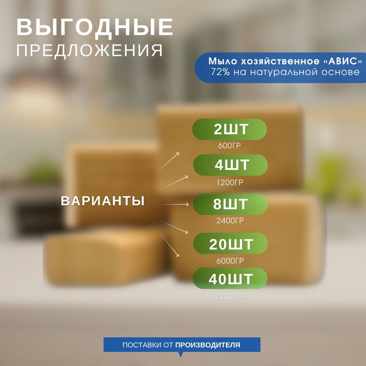 Мыло хозяйственное 72% натуральное твердое кусковое Авис, универсальное для мытья рук и стирки белья 300 гр 8 шт.