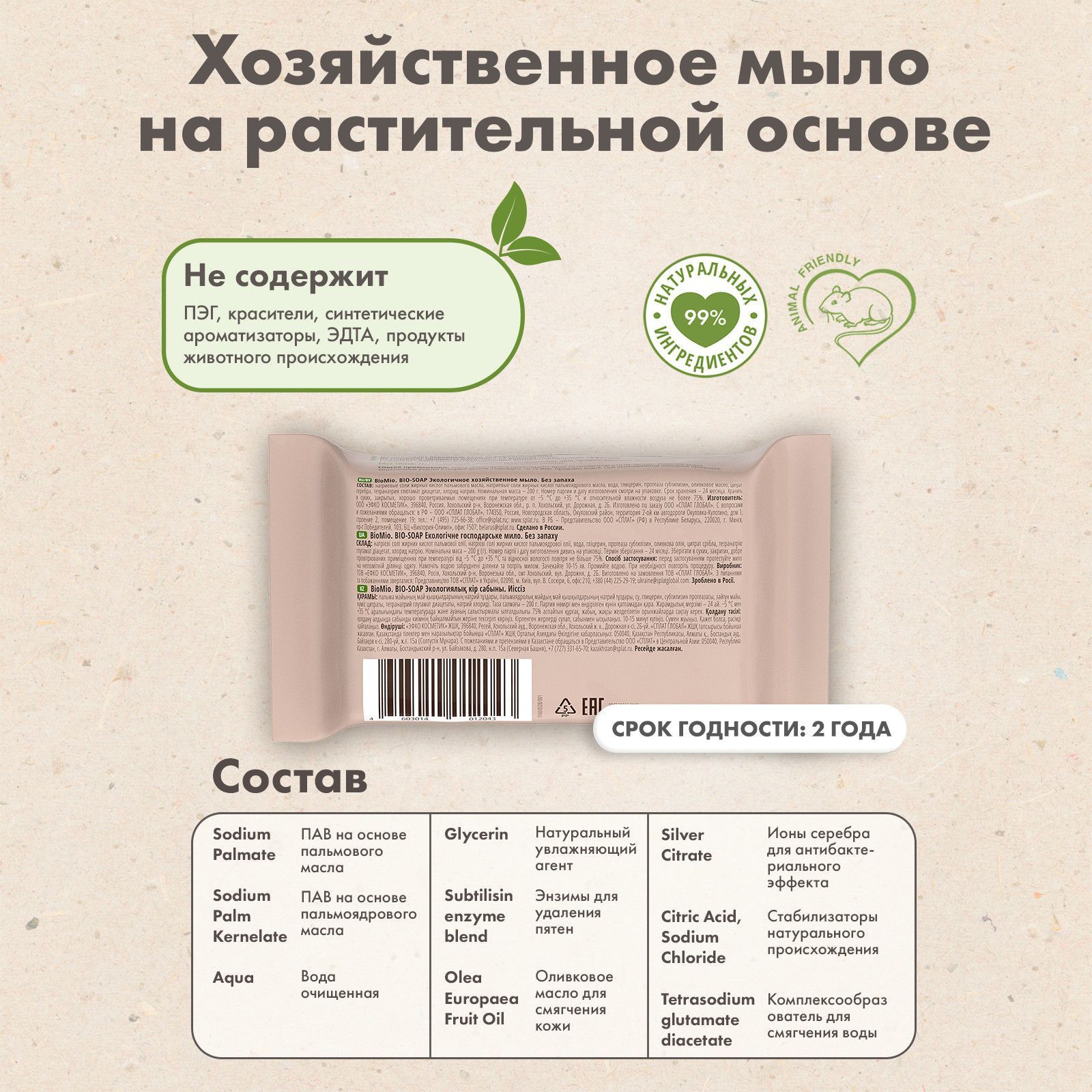 Описание: Экологичное хозяйственное мыло-пятновыводитель BIO-SOAP эффективно удаляет пятна от растительных масел и жира, фруктовых соков, следов от дезодоранта, а также белковые пятна (в том числе пятна крови, яиц, молока) благодаря специальной формуле, обогащенной биоэнзимами. Мыло гипоаллергенно, благодаря чему отлично подходит для стирки детского белья и одежды людей с чувствительной кожей. Специальная формула с оливковым маслом и глицерином обеспечивает бережный уход за кожей, а ионы серебра обладают антибактериальным эффектом. Прямоугольная форма мыла очень удобна в использовании, а непромокаемая упаковка флоу-пак подходит для многократного применения, что позволит хранить мыло в чистоте и порядке. Мыло BioMio – 100% вегетарианское – в его составе отсутствуют компоненты животного происхождения. НЕ СОДЕРЖИТ: ПЭГ, красители, синтетические ароматизаторы, ЭДТА, продукты животного происхождения. BioMio - линейка эффективных средств для дома, использование которых приносит удовольствие. Продукты, созданные с любовью и заботой, идеально справятся с загрязнениями, оставаясь при этом абсолютно безопасными, экологичными и особенно незаменимыми, если в доме есть малыш. Рекомендации по применению: перед применением протестируйте мыло на незаметном участке одежды. Намочите водой загрязненные участки и потрите мылом. Подождите 10-15 мин. Промойте водой. При необходимости повторите процедуру. Объем: 200 гр