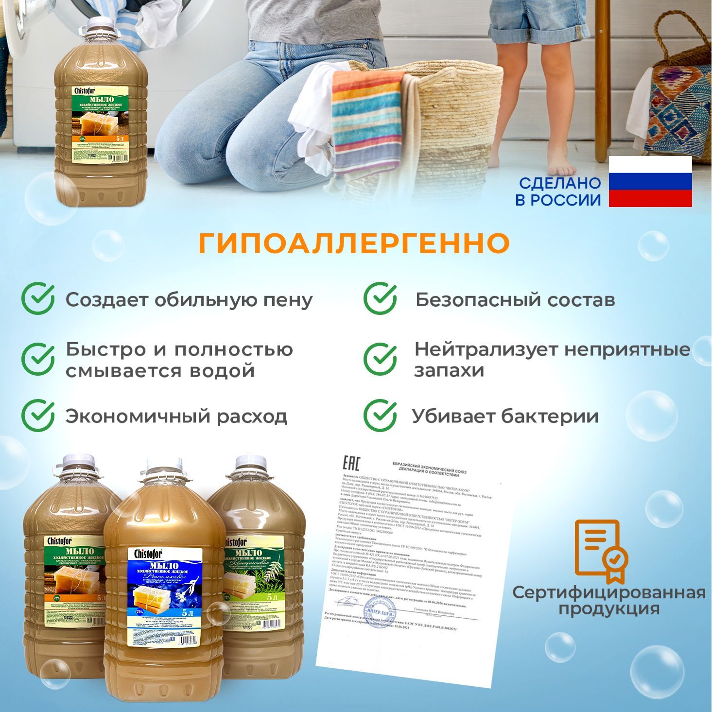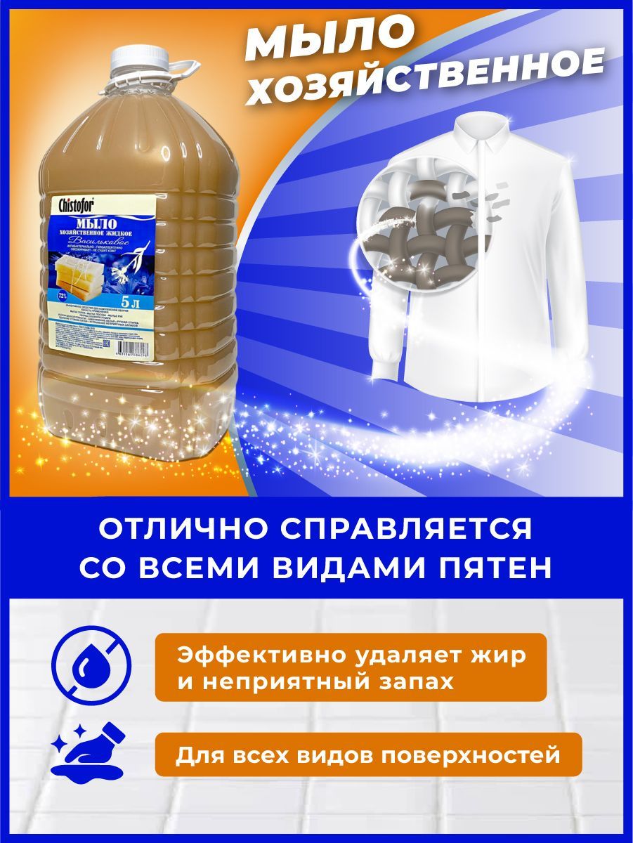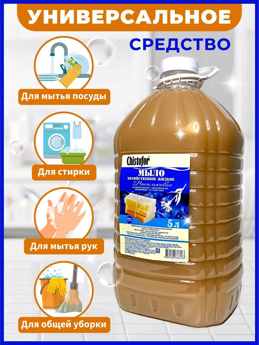 Описание: Жидкое хозяйственное мыло - это синоним экологичности и безопасности. Хозяйственное мыло 72 Chistofor 5 литров является незаменимым универсальным моющим средством в любом доме. Его применение обширно. Не нужно иметь различные очищающие порошки и гели, достаточно иметь мыло универсальное и оно заменит вам моющие средства для кухни (кухонное хоз мыло), против запаха, средство для стирки белья. Используйте мыло 5л как моющее средство для мытья посуды. Повышенные очищающие качества, легкое вспенивание и жидкая консистенция будут неплохим подспорьем хозяйкам. Средство для стирки, чистки ковров, мыло для чистки унитаза, для обуви, моющее вместо хлорки для пола - всё это сочетает в себе хозяйственное эко мыло отбеливающее Chistofor. Безопасно и практично в быту, надежно защищает от патогенных микробов. Также жидкое мыло пенка применяют в качестве гигиенических целей: для рук натуральное - мыло пена гипоаллергенное и экологичное, не сушит, не раздражает кожу рук, уход за руками станет более комфортным. Для водных процедур мыло пенка жидкое применяется как детское для рук антибактериальное и душа, для взрослых и детей, как мыло для кистей, для бани (банное), армейское (военные товары для армии). Экологичный натуральный продукт не вызывает аллергии. Мыло средство пятновыводитель, благодаря содержанию щёлочи, прекрасно помогает от пятен на одежде и грязи, антипятин удаляет сложные застарелые загрязнения. Подходит для стирки белого, цветного белья, одежды для маленьких детей. В отличие от классического мыла маленького, жидкое можно использовать для ручной и машинной стирки, традиционное твёрдое, черное мыло, дуру неудобно держать в руках, оно быстро размокает в воде, а для машинной стирки возможно использовать только хозяйственное мыло стружка, но это совсем не практично. Мыло жидкое хозяйственное универсальное для рук и тела 5 литров имеет легкую гелевую консистенцию, хорошо пенится и легко смывается с любых поверхностей, не оставляя мыльного налета. Одинаково эффективно как в горячей, так и холодной воде. Расходуется довольно экономично, по желанию можете приобрести для мыла диспенсер. Не содержит красители для мыла, цвет натурально - коричневый (бежевый). Упаковка для мыла - пластиковая ёмкость канистра 5 л., такая бутылка для мыла поможет забыть о покупке средства надолго. Применение: мытье пола, стен необходимо 30 мл мыла растворить на 5 литров воды. Для влажной уборки растворите 50-75 мл на 5 литров воды. Это отличное средство для комплексной уборки и дезинфекции всего дома. Приобретите эко товары для дома: жидкость, средство моющее для мытья посуды 5 литров, бытовая химия, средства для стирки белья и прочие хозяйственные товары для дома, дачи в одном лице хозяйственного мыла Chistofor. Тогда ежедневные процедуры, такие как стирка, мойка и уборка будут точно в радость! Производство Россия - отличная и экономичная альтернатива таким средствам, как мыло хозяйственное корея, японское, финское.