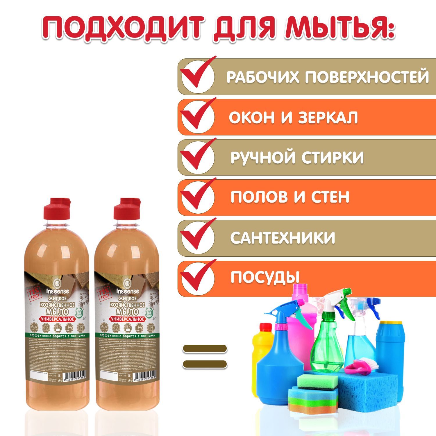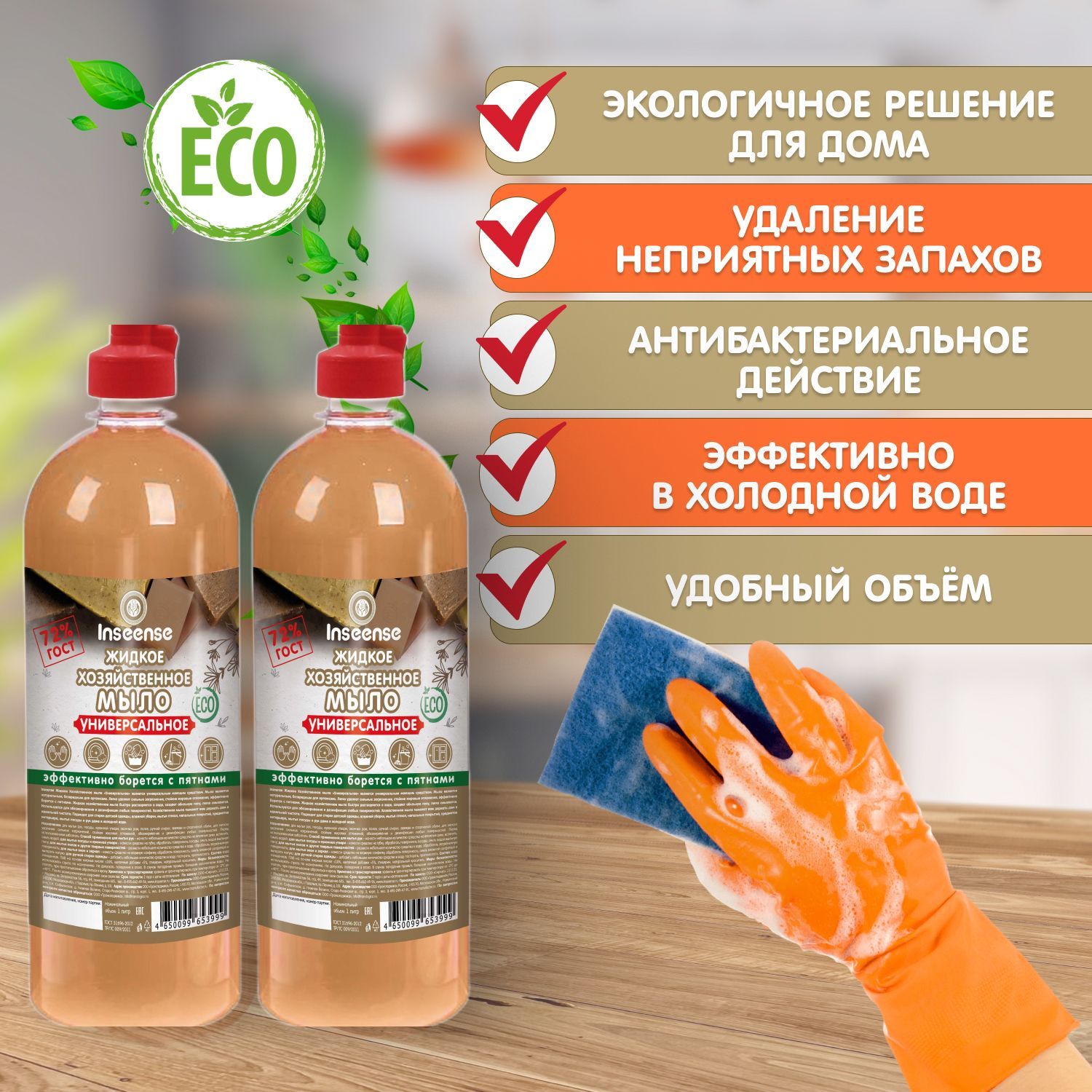 Описание: Создайте идеальную чистоту в Вашем доме без вреда для здоровья с помощью эксклюзивного жидкого хозяйственного мыла Inseense! Премиальное качество хозяйственного мыла Инсинс в новом жидком формате и входящие в него натуральные компоненты делают мыло многофункциональным, экологичным и удобным в использовании. Его преимущества очевидны: небольшой расход средства поможет привести в порядок не только кухню, но и весь дом. Мыло с легкостью справляется с любыми видами загрязнений на напольных покрытиях: ламинат, линолеум, плитка, паркет. Поможет избавиться от сложных пятен на ковровых покрытиях. Можно использовать для влажной уборки, мытья окон, зеркал и стен.  Ваша кухня будет блестеть, так как жидкое мыло Inseense легко справляется с стойкими жировыми отложениями и эффективно даже в холодной воде. Посуда, сантехника, рабочие поверхности и любое кухонное оборудование станут безупречно чистыми. Никаких разводов, налета и пятен! Мыло быстро растворяется в воде, легко смывается и имеет приятный нейтральный аромат. Идеально подходит для ручной стирки и замачивания любых видов тканей, а также детской одежды и обуви. Имеет антибактериальный эффект и его можно использовать в качестве средства для мытья рук. Inseense заботится о природе, поэтому вся продукция соответствует экологическим нормам.