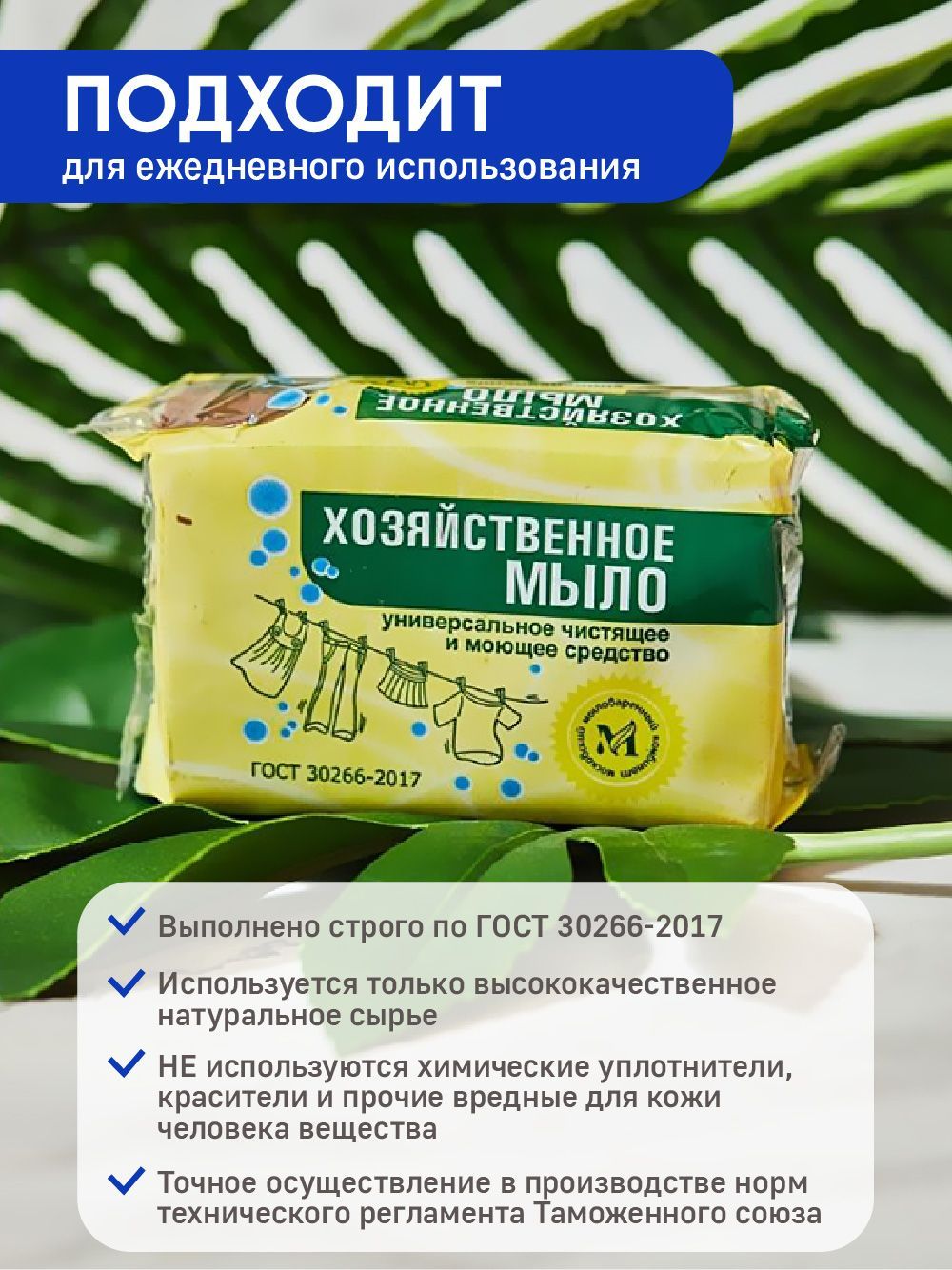 Описание: Мы предлагаем попробовать набор мыла хозяйственного твёрдое 72 % , изготовленное согласно ГОСТ 30266-2017, производитель  ООО «ММК». Это экологически чистый и безопасный продукт, который производится из животных жиров. В составе хозяйственного мыло содержится небольшое количество щелочи, помогающее быстро удалять загрязнения. При этом максимально снижен риск аллергических реакций, ввиду натурального состава. Цвет мыла от светло-жёлтого до темно-коричневого. Хозяйственное мыло можно использовать в бытовых целях для мытья пластиковых, керамических, каменных, металлических поверхностей. Хорошо мылится в воде любой жесткости и полностью смывается водой. Предназначено для стирки белых и цветных материалов, качественно стирает в холодной и горячей воде, прекрасно подходит для замачивания белья, мытья полов и ковровых покрытий, выведения пятен и дезинфекции очищаемых поверхностей. Также мыло хозяйственное используют как средство от перхоти. При регулярном мытье головы вы забудете про перхоть. Но после мытья лучше использовать бальзам для волос. И это лишь только малая часть того, для чего можно применять мыло в быту, как народное средство Предназначено для стирки изделий из различных тканей, а также для санитарно-гигиенических и промышленных целей. Универсальное мыло можно использовать для мытья и обработки рук, обладает антибактериальными свойствами, для замачивания и стирки деликатных тканей, для стирки белого белья, стирки цветных тканей. Отлично удаляет пятна даже в холодной воде. Обработка стен и различных поверхностей. Хозяйственное мыло можно использовать для уборки пола и отбеливание полотенец. Это экологичное средство гигиены можно также использовать как Эко средство для мытья рук и посуды. Из куска можно приготовить стружку, порошок, жидкое мыло.
