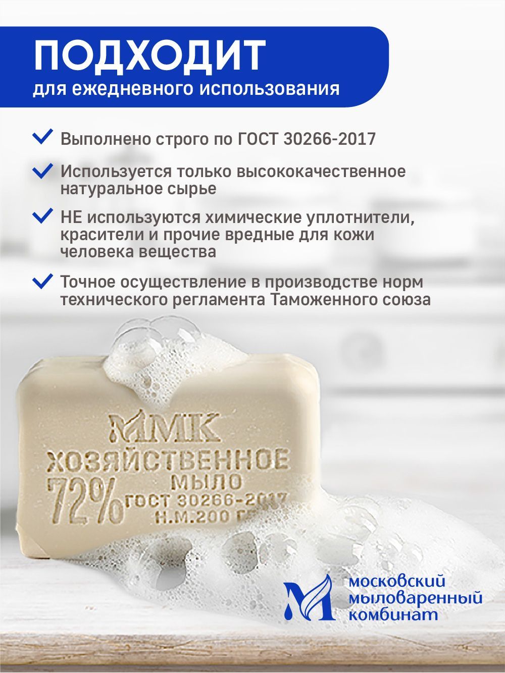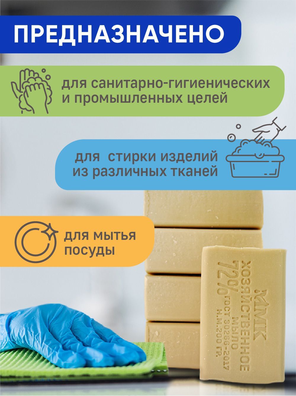 Описание: Мы предлагаем попробовать набор мыла хозяйственного твёрдое 72 % , изготовленное согласно ГОСТ 30266-2017, производитель  ООО «ММК». Это экологически чистый и безопасный продукт, который производится из животных жиров. В составе хозяйственного мыло содержится небольшое количество щелочи, помогающее быстро удалять загрязнения. При этом максимально снижен риск аллергических реакций, ввиду натурального состава. Цвет мыла от светло-жёлтого до темно-коричневого. Хозяйственное мыло можно использовать в бытовых целях для мытья пластиковых, керамических, каменных, металлических поверхностей. Хорошо мылится в воде любой жесткости и полностью смывается водой. Предназначено для стирки белых и цветных материалов, качественно стирает в холодной и горячей воде, прекрасно подходит для замачивания белья, мытья полов и ковровых покрытий, выведения пятен и дезинфекции очищаемых поверхностей. Также мыло хозяйственное используют как средство от перхоти. При регулярном мытье головы вы забудете про перхоть. Но после мытья лучше использовать бальзам для волос. И это лишь только малая часть того, для чего можно применять мыло в быту, как народное средство Предназначено для стирки изделий из различных тканей, а также для санитарно-гигиенических и промышленных целей. Универсальное мыло можно использовать для мытья и обработки рук, обладает антибактериальными свойствами, для замачивания и стирки деликатных тканей, для стирки белого белья, стирки цветных тканей. Отлично удаляет пятна даже в холодной воде. Обработка стен и различных поверхностей. Хозяйственное мыло можно использовать для уборки пола и отбеливание полотенец. Это экологичное средство гигиены можно также использовать как Эко средство для мытья рук и посуды. Из куска можно приготовить стружку, порошок, жидкое мыло.