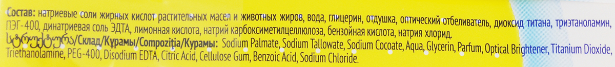 натриевые соли жирных кислот растительных масел и животных жиров, вода, глицерин, оптический отбеливатель, диоксид титана, триэтаноламин, ПЭГ-400, динатриевая соль ЭДТА, лимонная кислота, натрий карбоксиметилцеллюлоза, бензойная кислота, натрия хлорид