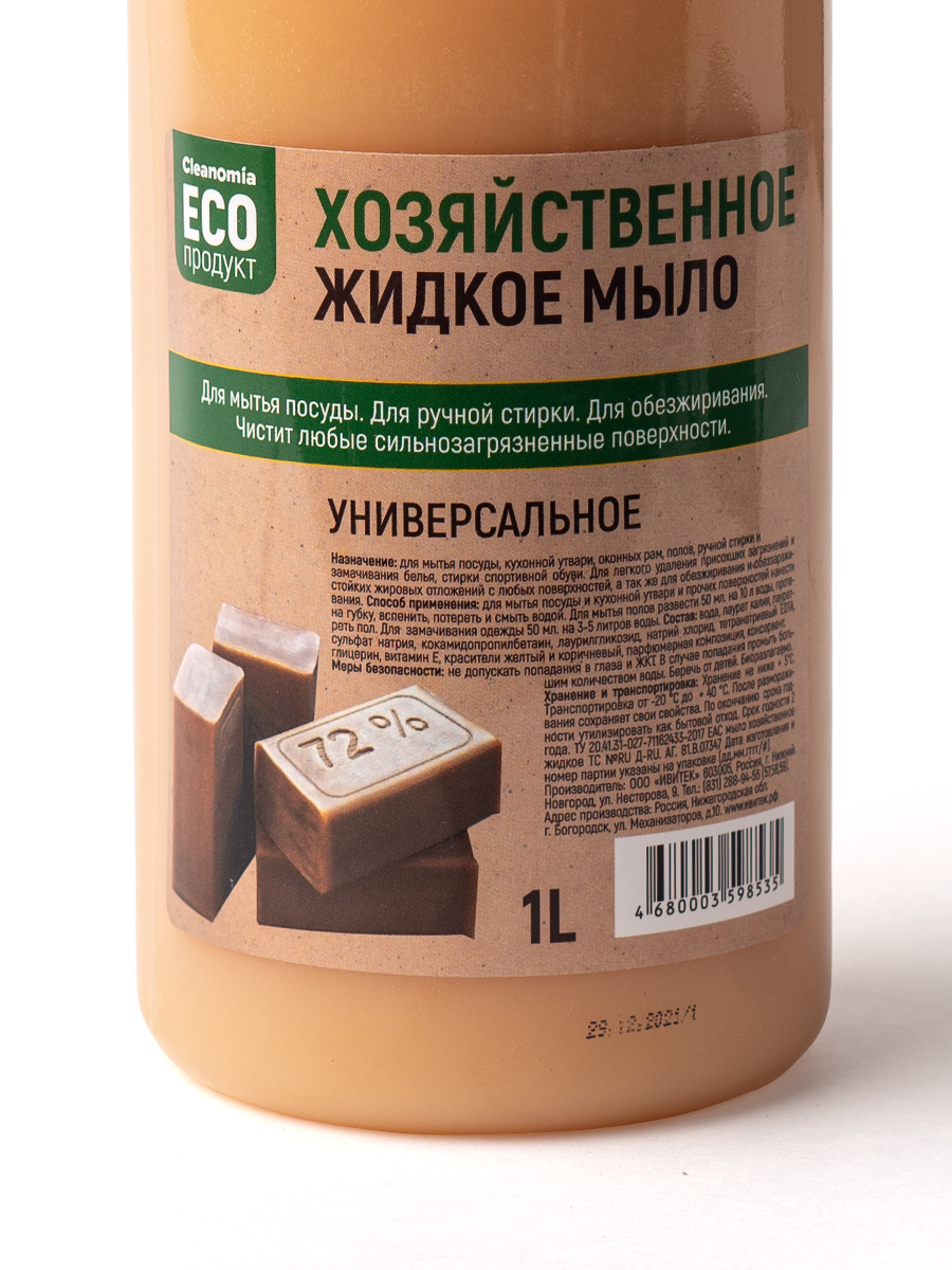 Мыло хозяйственное жидкое 72% для стирки Cleanomia 1 литр с дозатором