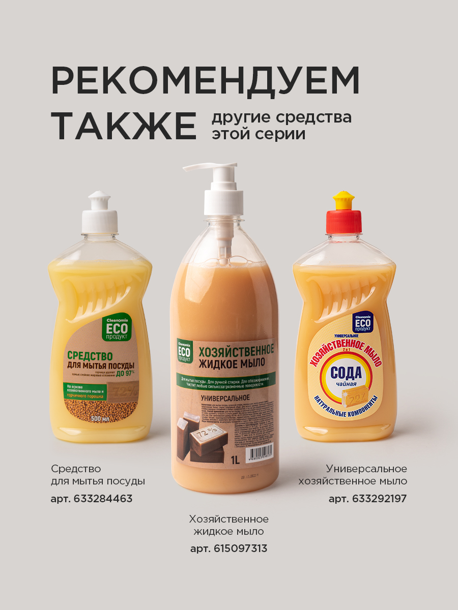 Описание: Универсальное хозяйственное жидкое мыло Cleanomia найдет свое применение для уборки дома, стирки белья и обуви, мытья посуды. Это эко средство содержит натуральные компоненты без запахов, можно применять и для купания животных. Оно безопасно для шерсти.Целесообразно использовать в бане, удобно мыться на даче (хорошо отмывает руки от грязи). Мыло можно развести в канистре с водой, получиться большой объем моющего средства.Хозяйственное жидкое мыло Cleanomia часто используют для уборки офисов. Кожа рук не раздражается, потому что это экологичный продукт. Мыло можно использовать как универсальное чистящее средство, ведь оно убирает загрязнения с любых поверхностей.При разведении с водой получается достаточное количество пены, поэтому средство является и экономичным. Им можно обрабатывать внутреннюю поверхность обуви, так как мыло обладает и антибактериальным эффектом.Удобная бутылка 1 литр. Помещается на раковину.