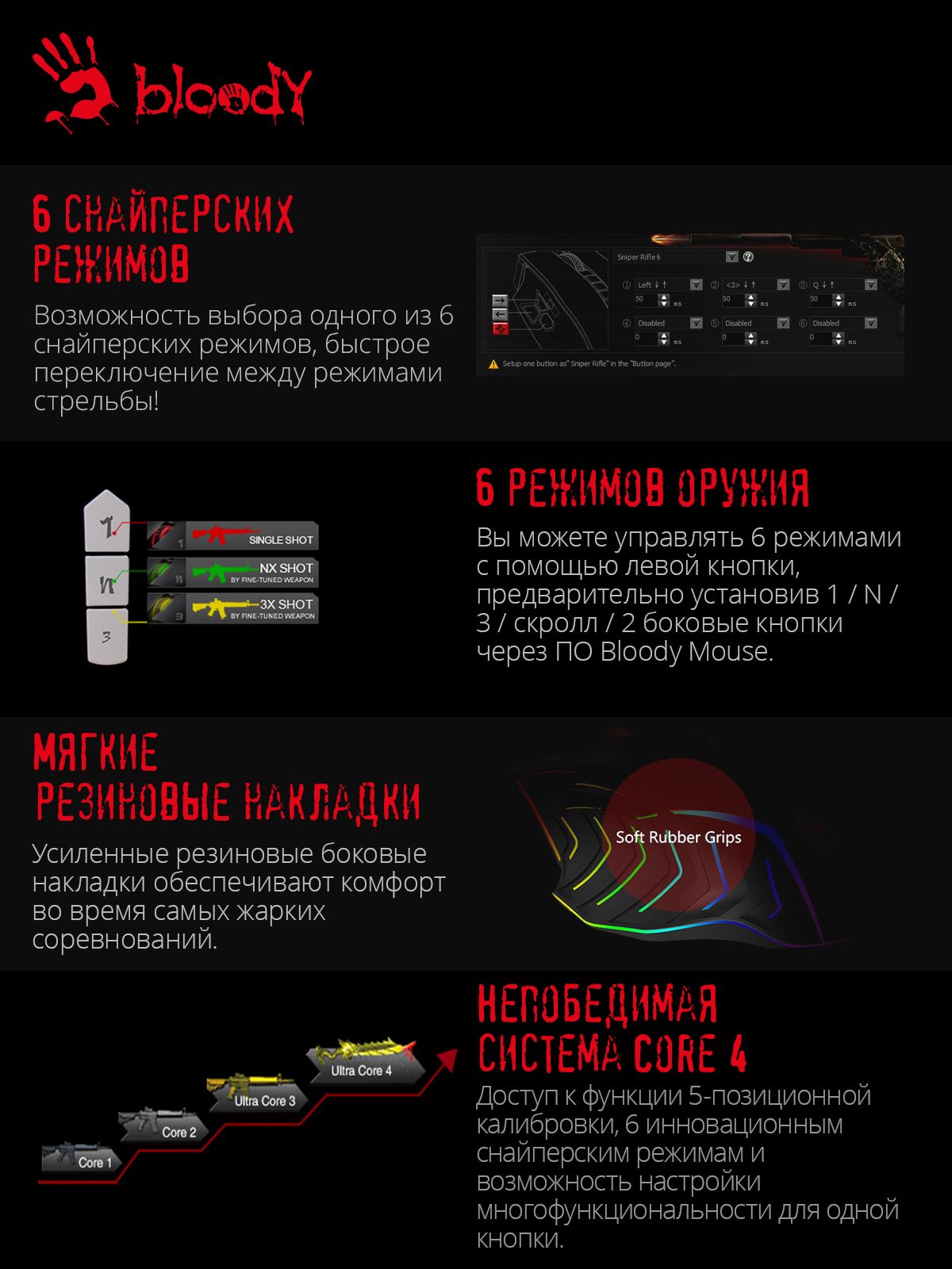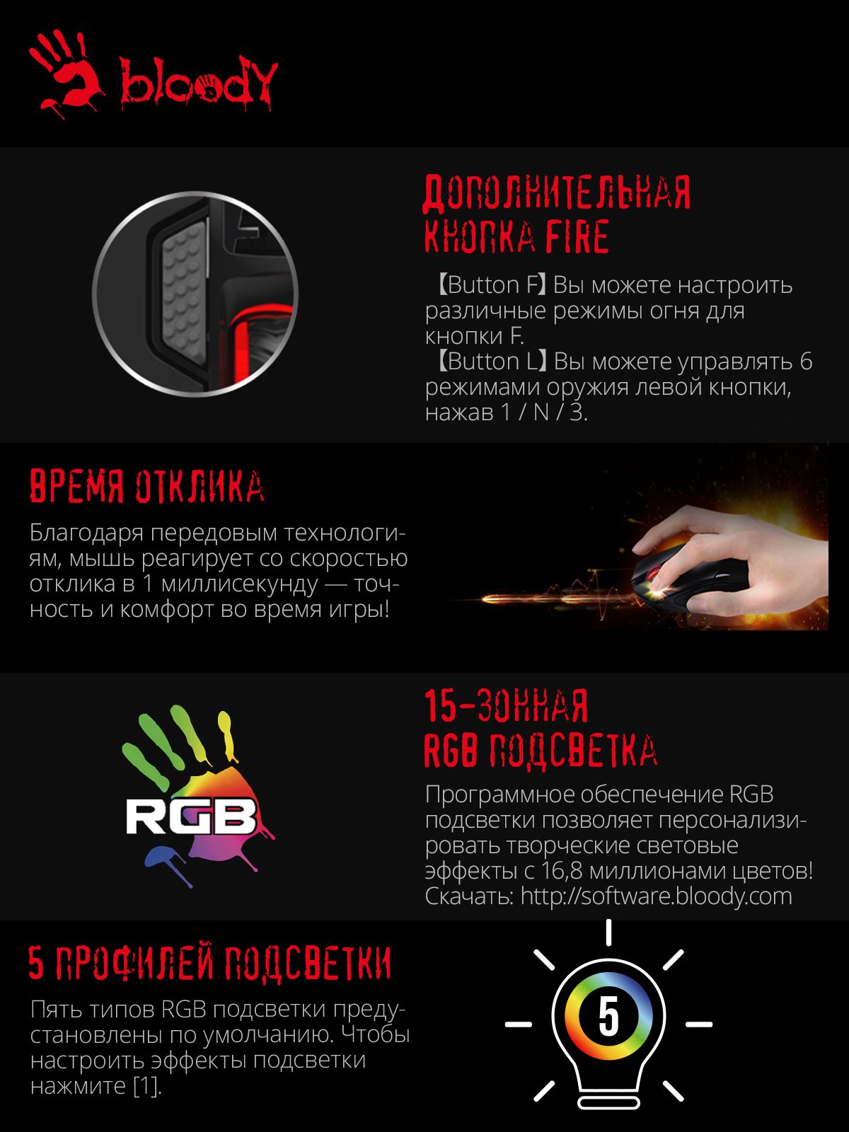 Высокотехнологичной мышью A4 Bloody J95s могут пользоваться геймеры с правой рабочей рукой. Надежность подчеркнута наличием проводного USB соединения и параметром MTBF в 20000000 кликов. Помимо функциональных преимуществ, игровая мышь обладает внешней привлекательностью. Молодежный дизайн с рисунком и 5-зонной подсветкой с яркими эффектами производит впечатление на геймеров.