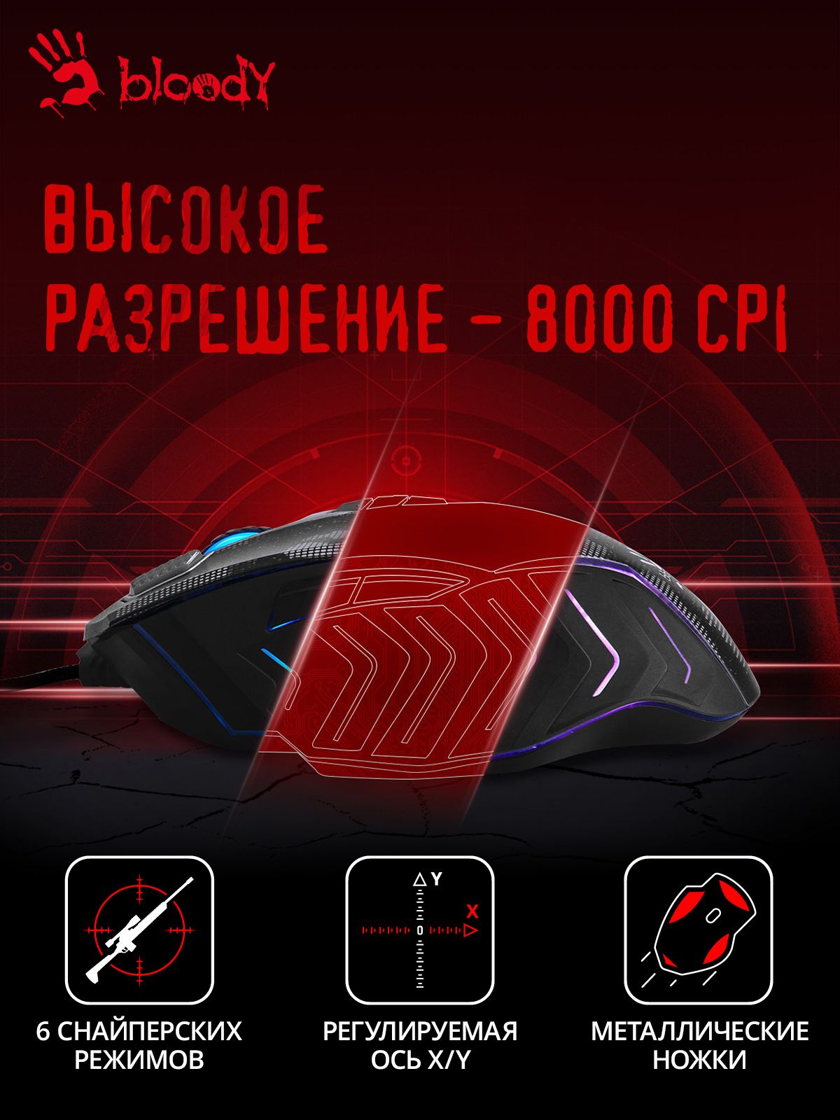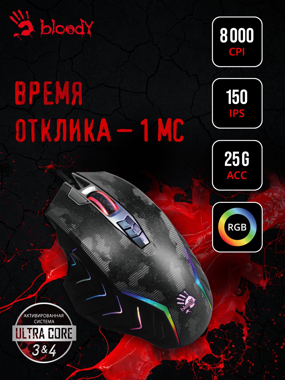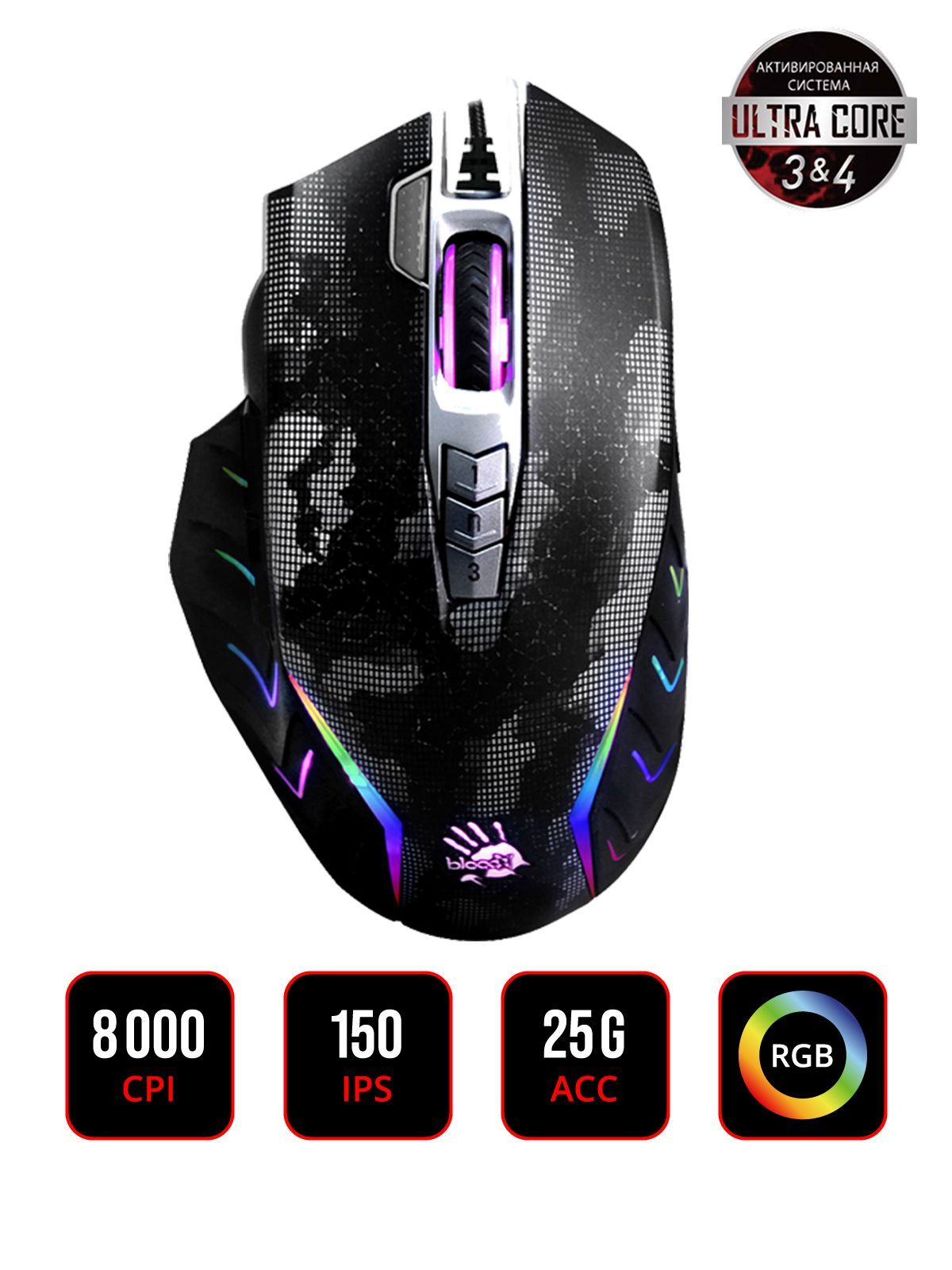 Мышь A4Tech Bloody J95s рисунок, оптическая, разрешение сенсора 8000dpi, проводная, длина провода 1.8м, кнопок: 9, подходит для правой руки (J95S SATELLITE ACTIVATED)
