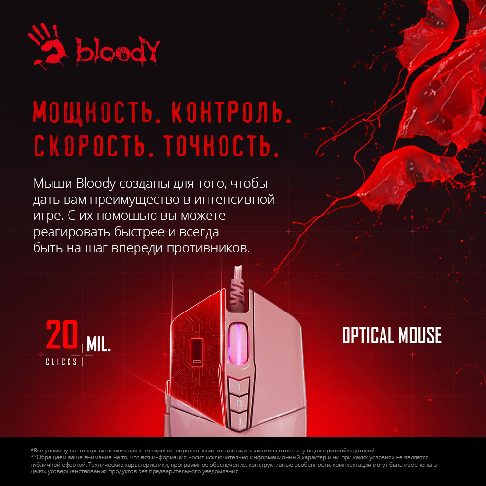 Особенности: Регулировка по осям X / Y 6 режимов стрельбы для левой кнопки Прорезиненные боковые вставки Металлические ножки X' Glide Прорезиненный скролл. при установке ПО Bloody7, уровни core3,4 активированы бесплатно
