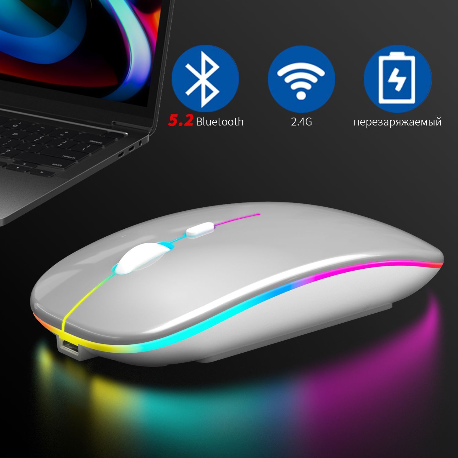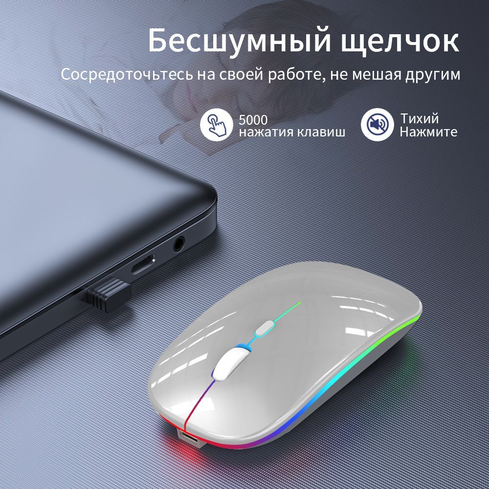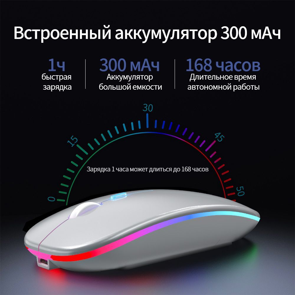 • Обновленная версия беспроводной мыши со светодиодной подсветкойВ нижней части беспроводной мыши есть переключатель, поддерживающий независимое открытие основных функций мыши и декоративный режим дыхательной подсветки. Когда вы включаете режим светодиодной подсветки, он может циклически трансформироваться в множество различных цветов, добавляя веселья в скучную работу и жизнь.