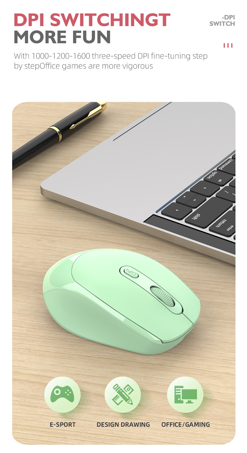 Вы можете наслаждаться отзывчивым и плавным управлением курсором с помощью (регулируемого) невидимого механизма отслеживания высокой четкости 800-1200-1600DPI.
