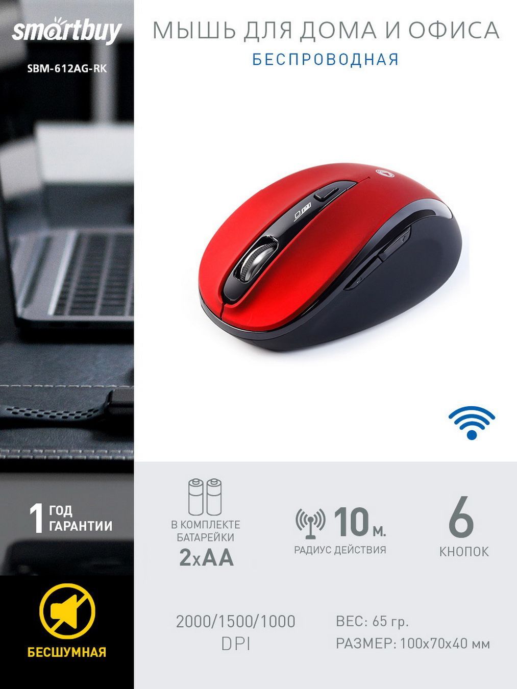 Описание: Беспроводная мышь SBM-612AG это настоящий хит, который выбрало огромное количество пользователей. Модель отлично подходит для обладателей среднего размера ладони. Бесшумные клавиши мыши имеют приятный отклик и позволяют работать даже в спокойной, тихой обстановке. Износостойкое покрытие «Soft-touch» имеет приятные тактильные ощущения. Оптический сенсор имеет 3 ступени разрешения: 1000/1500/2000 DPI - вы сможете быстро настроить нужную скорость курсора под себя. Технология автоматического отключения питания бережёт заряд батареек, которые идут в комплекте (тип АА). Всего 6 кнопок управления (правая, левая, колесо прокрутки, вперёд, назад, кнопка смены разрешения сенсора DPI). Платформы внизу мыши обеспечивают гладкое скольжение практически на любой поверхности. USB-ресивер расположен в блистере.