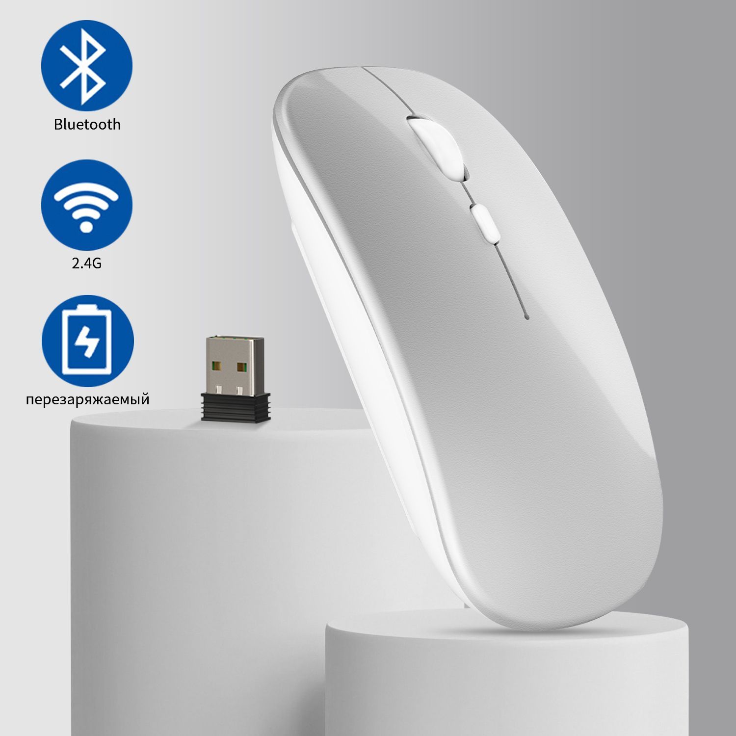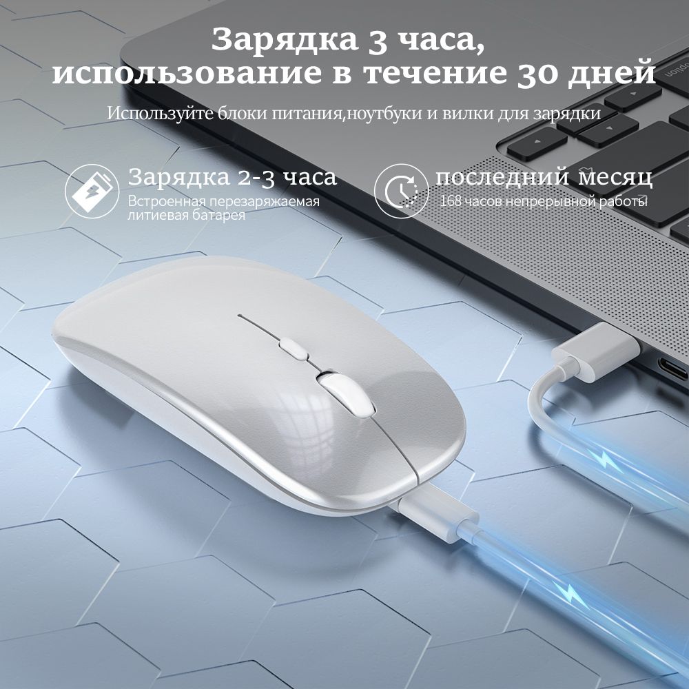 мышь беспроводная бесшумная компьютерная мышь bluetooth, аккумуляторная мыши для ноутбука ПК, серебро