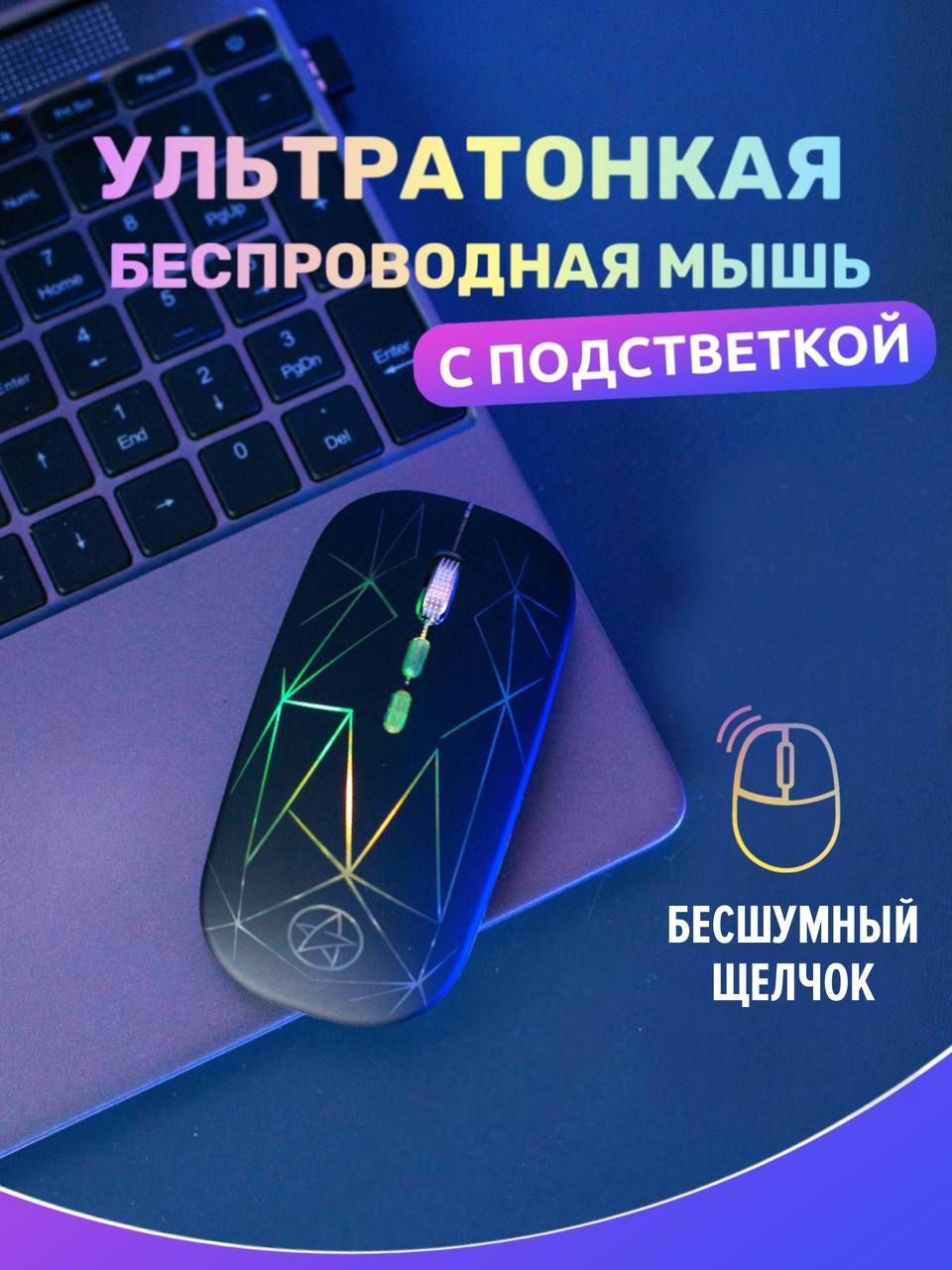 Мышь беспроводная Бесшумная с встрoeнным аккумулятором/ с RGB подсветкой / для пк и ноутбуков /, черный матовый
