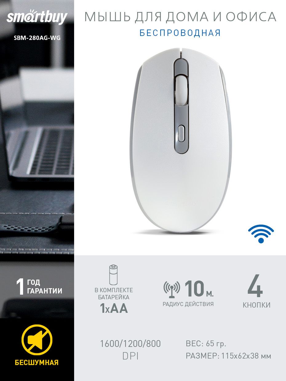 Мышь беспроводная бесшумная Smartbuy ONE 280AG (SBM-280AG-WG), бело-серый