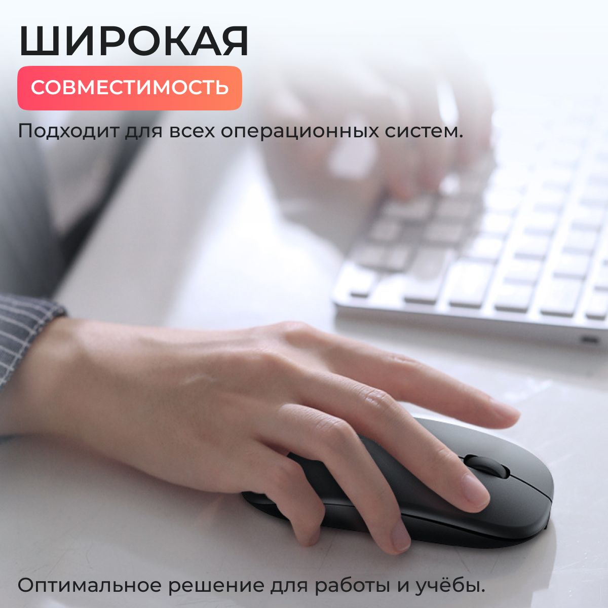 • Благодаря тонкому и обтекаемому дизайну бесшумной беспроводной мыши её легко можно положить в карман или сумку для ноутбука.