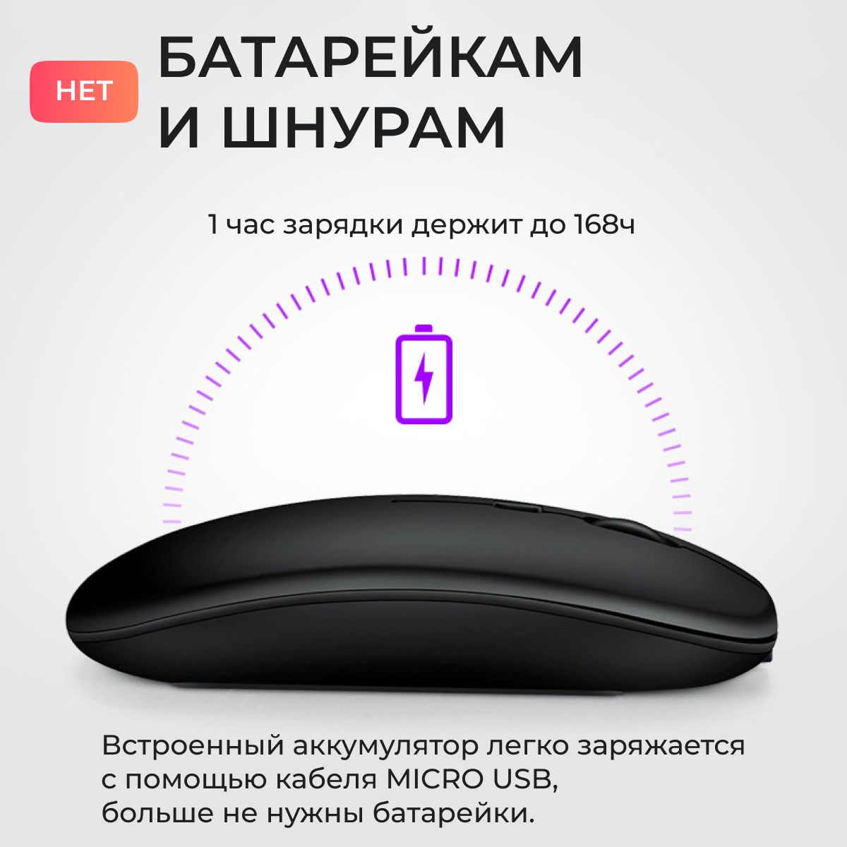 • В беспроводную bluetooth мышь встроенная прочная аккумуляторная полимерная батарея, которая заряжается с помощью прилагаемого USB-кабеля (батарейки не нужны).