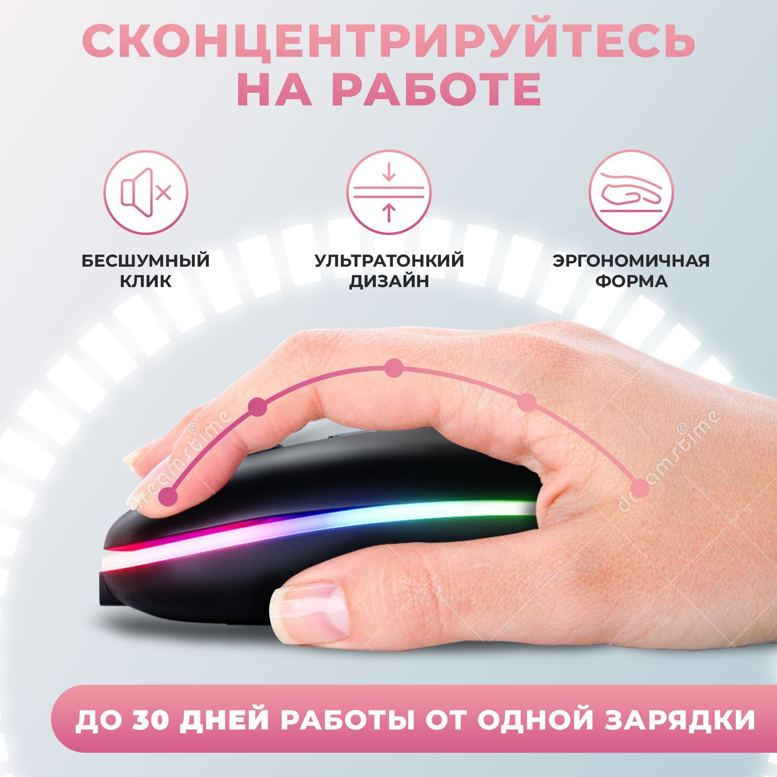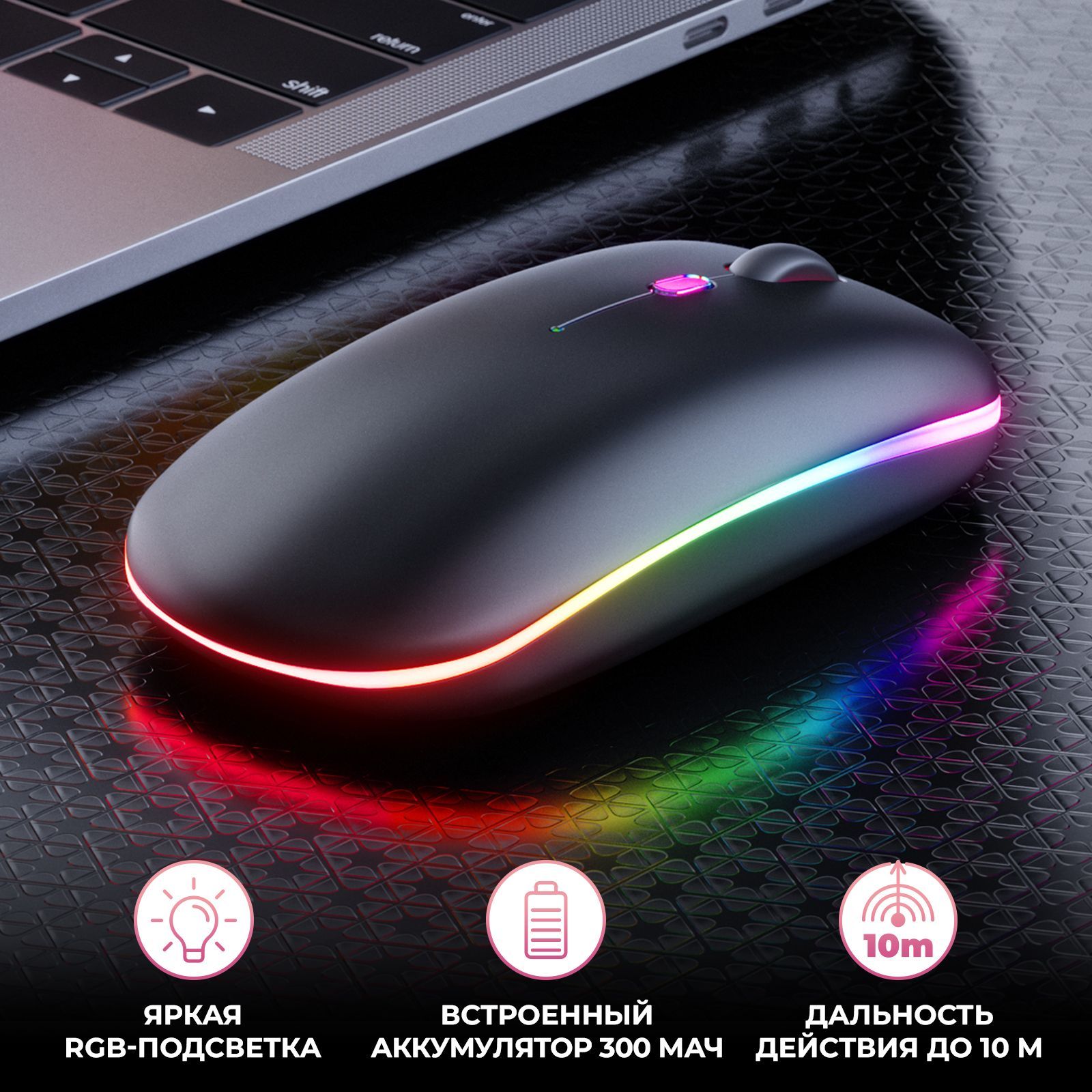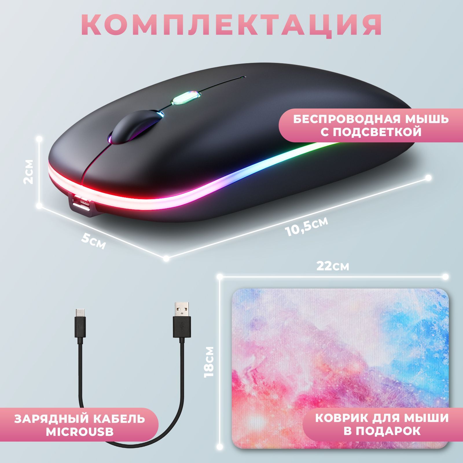 Описание: Беспроводная светодиодная мышь - незаменимая вещь в пользовании компьютером или ноутбуком. Благодаря тому, что мышка без провода, Вы можете брать ее с собой и пользоваться ей в любом месте, провод не будет Вам и Вашим окружающим мешать, ее также можно подключить к телефону. Мышь с подсветкой обладает высокой отзывчивостью, точным лазерным отслеживанием и быстрой реакцией с возможностью регулировки скорости перемещения. Более того в комплекте к данной мышке идет еще и коврик, что позволит Вам сэкономить время на поиске коврика. Заряжается мышь через usb-кабель, не требует батареек. Бесшумные кнопки снижают уровень шума на 90%, что делает её идеальной беспроводной мышью для офиса, конференц-зала, кафе, библиотеки, спальни, помогая вам сосредоточиться на работе, учиться, не беспокоя окружающих. Игровая мышь станет отличным дополнением к компьютеру или ноутбуку. Мышка для ноутбука оснащена двумя классическими кнопками, колесиком.