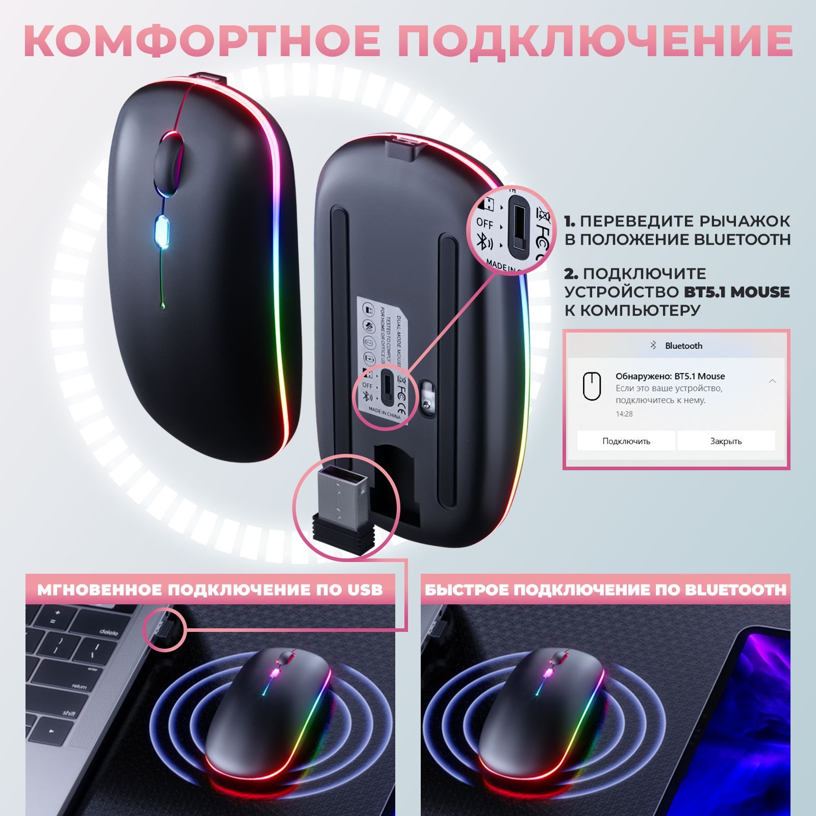 Мышь беспроводная компьютерная игровая бесшумная для компьютера, ноутбука, телевизора, планшета / Геймерская bluetooth (блютуз) мышка с подсветкой rgb для пк / Черная