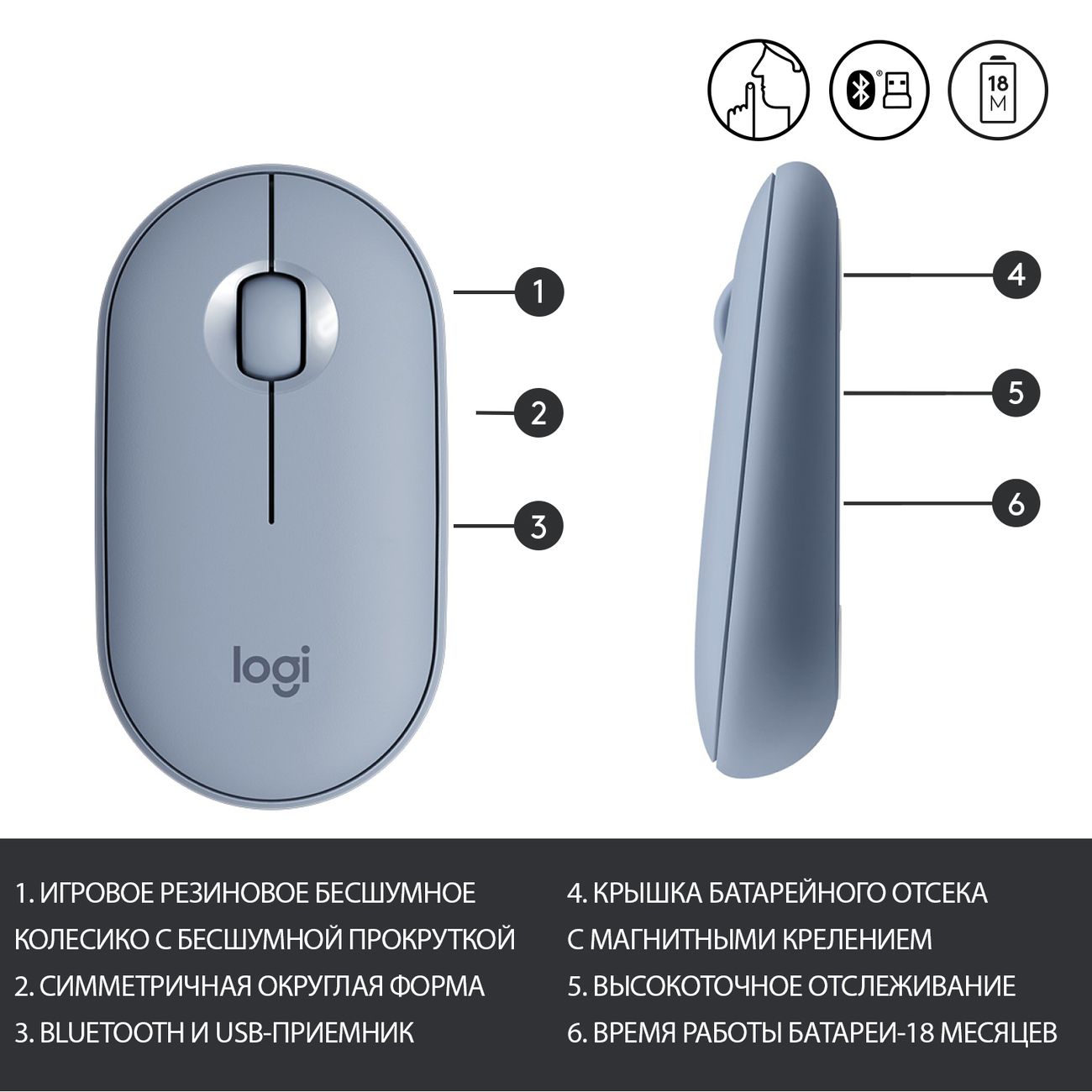 Описание: Беспроводная мышь Logitech M350 910-005719 Blueberry с симметричным корпусом серого и голубого цветов подходит для правой и левой руки. Соединение с компьютером или ноутбуком устанавливается по Bluetooth, используется приемный блок, который вставляется в USB-порт. Оптическое разрешение — 1000 т/д. Модель получает питание от батарейки AA, в которой хватит энергии примерно на 18 месяцев. Вес — 100 г.