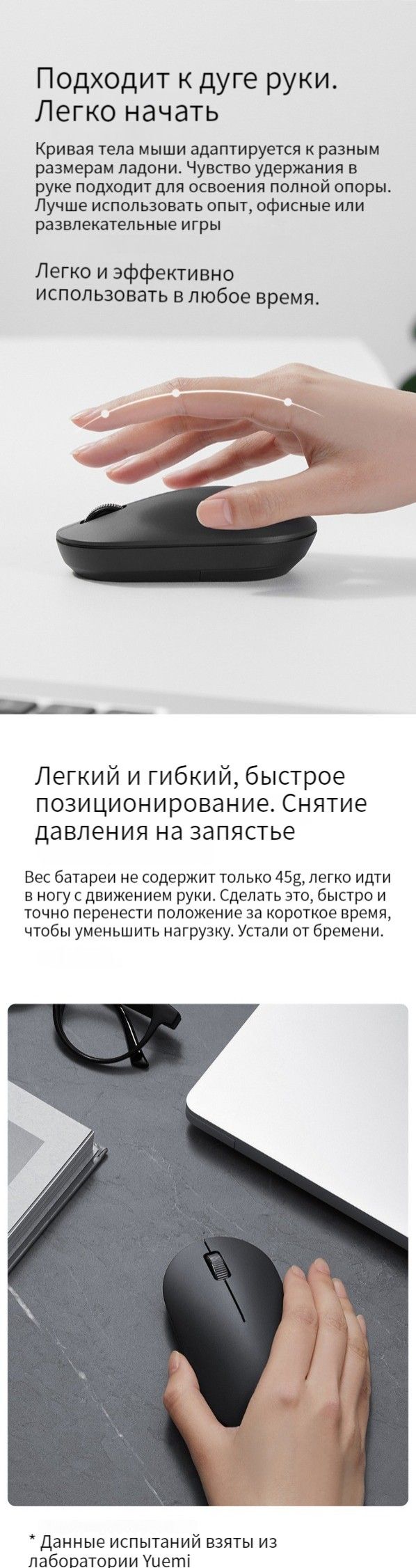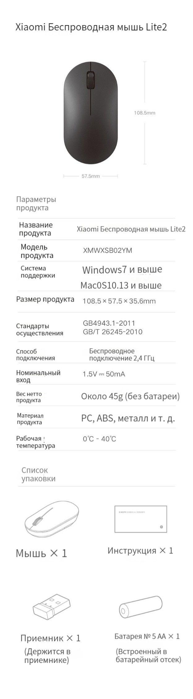 Описание: Беспроводная мышь Wireless Mouse Lite Black XMWXSB01YM оснащена высокоточным датчиком с разрешением 1000 DPI, подходит как для работы, учебы и игр. Беспроводное USB-подключение в диапазоне 2.4 GHz стабильно на расстоянии до 10 метров. Вес мыши с батарейкой составляет примерно 75 грамм, ее удобно брать с собой. Размеры корпуса составляют 113 x 60 x 36 мм. Эргономичная форма и чувствительность мышки не вызывает усталости и боли в запястье, мышь подходит для длительного использования. Симметричная форма подходит для правшей и левшей.