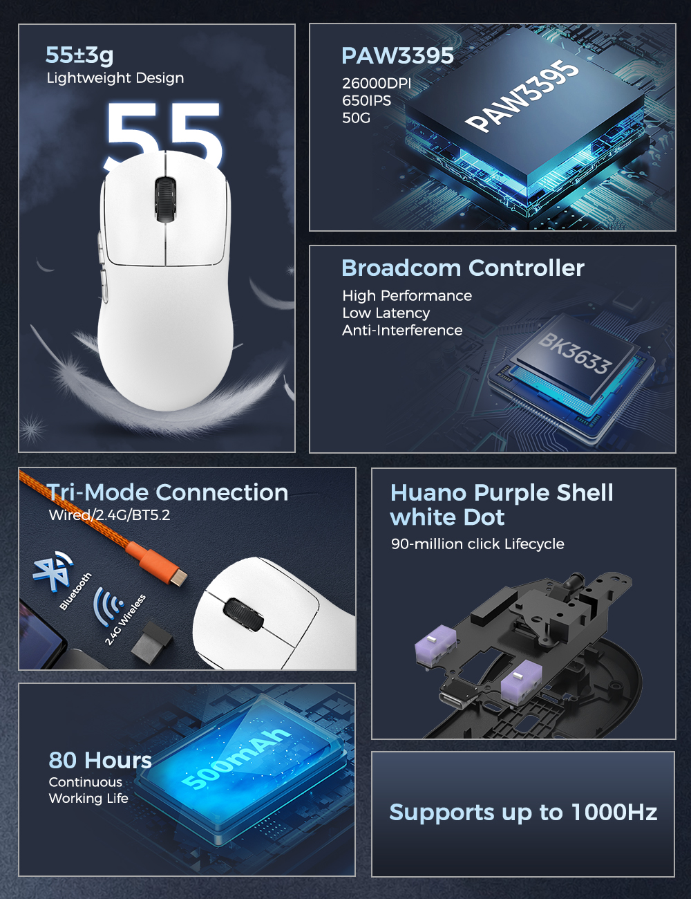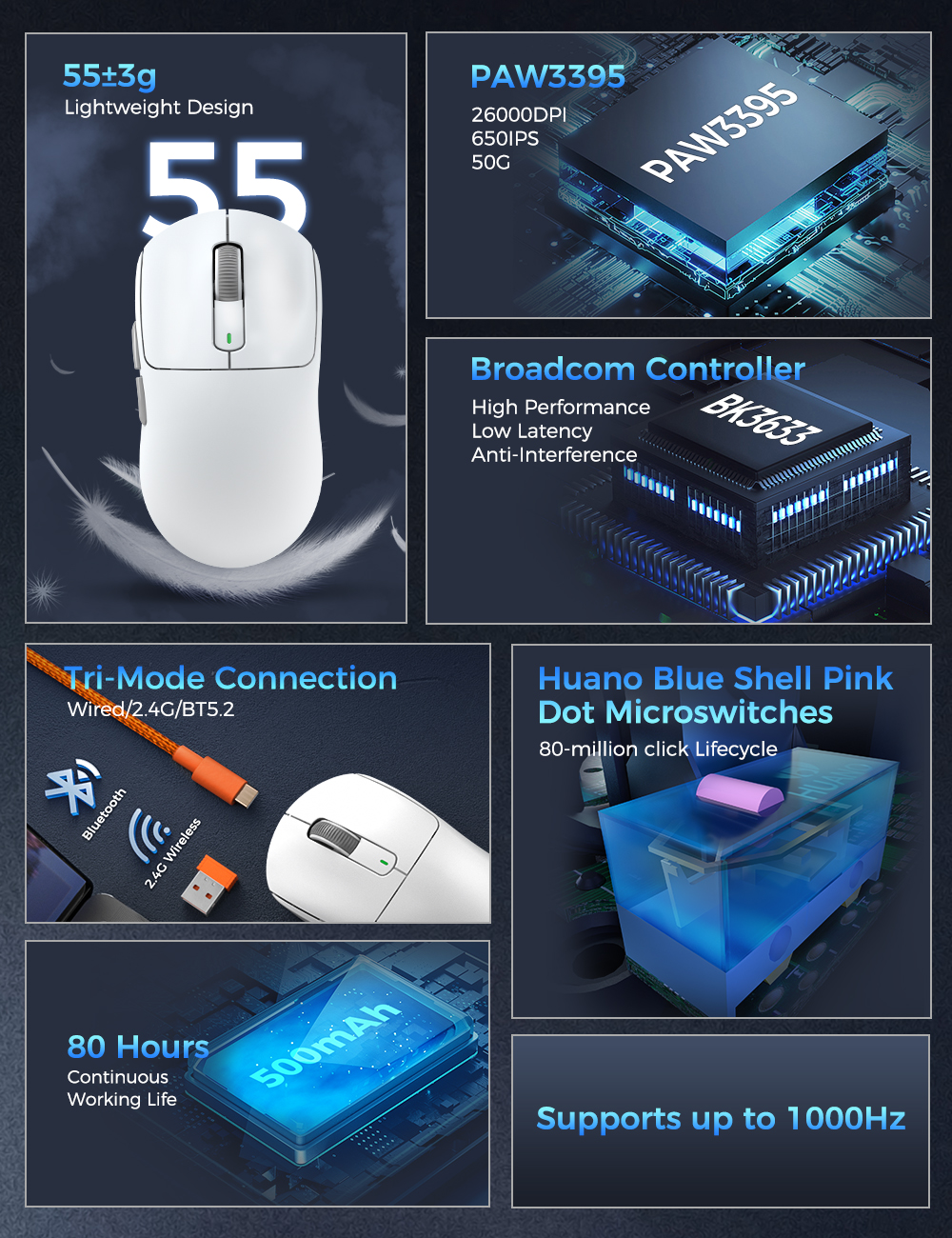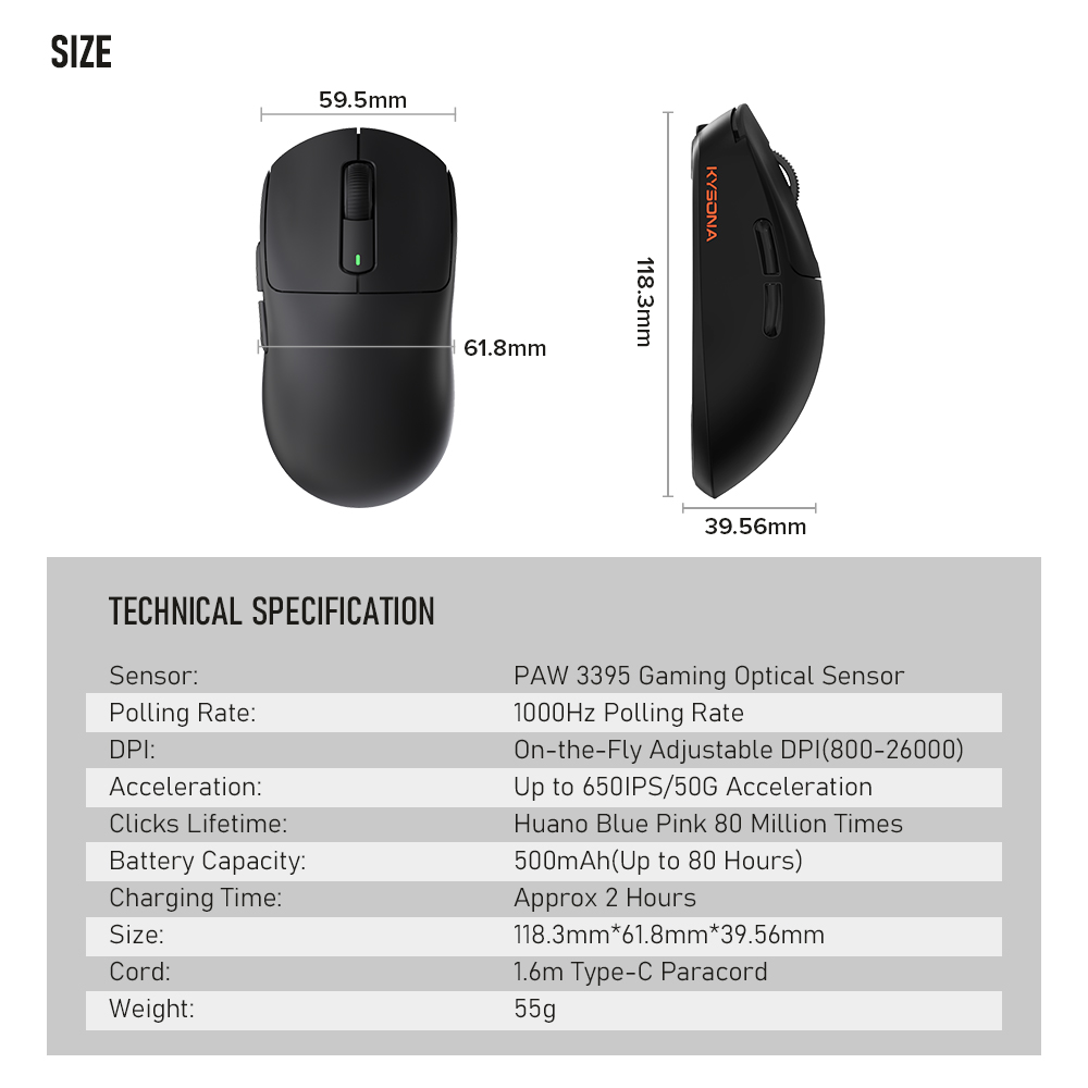 Мышь компьютерная беспроводная игровая для киберспорта, 55/26000DPI, 6 кнопок
