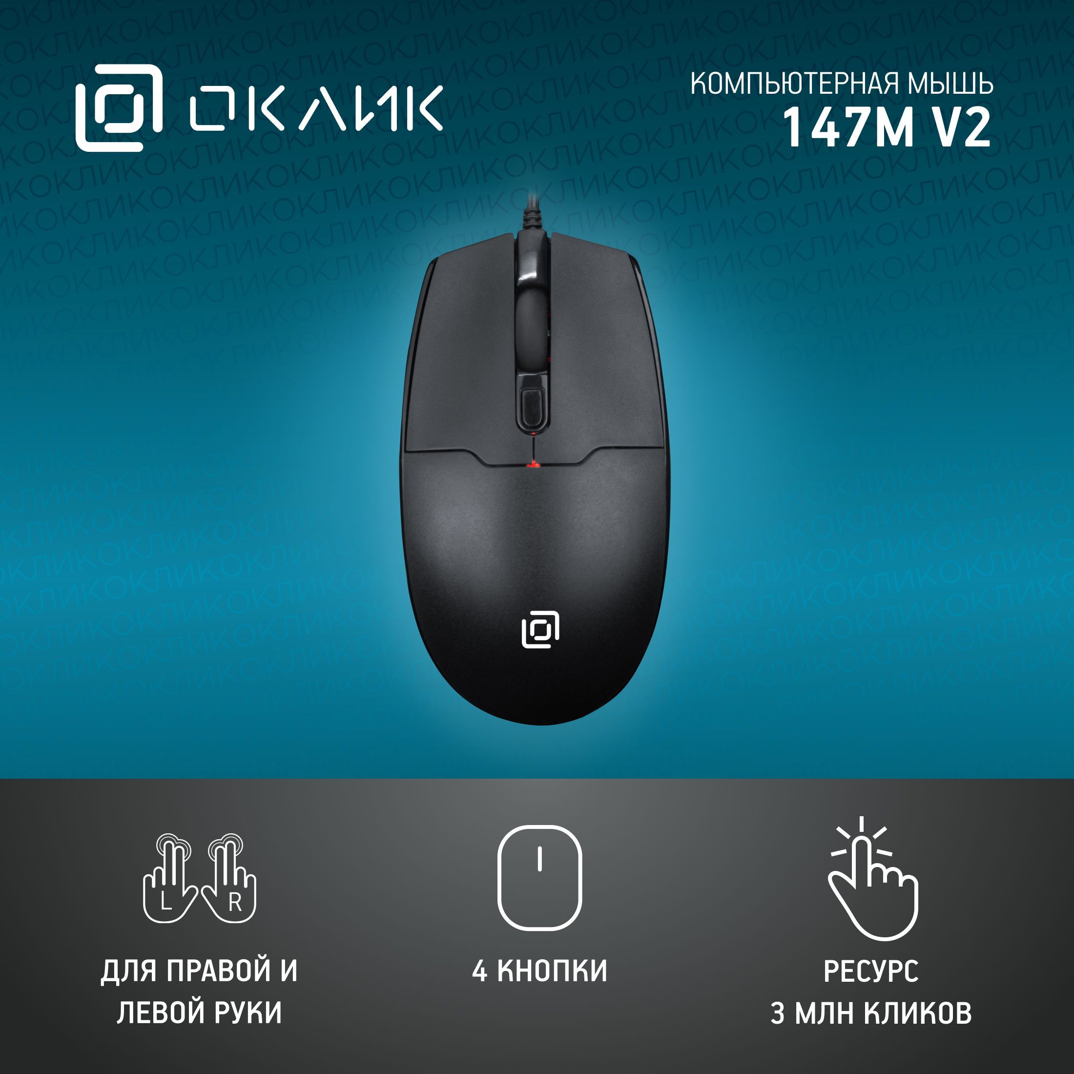 Мышь Оклик 147M V2 оптическая, 2000 dpi, USB, 4 кнопки, проводная, черная