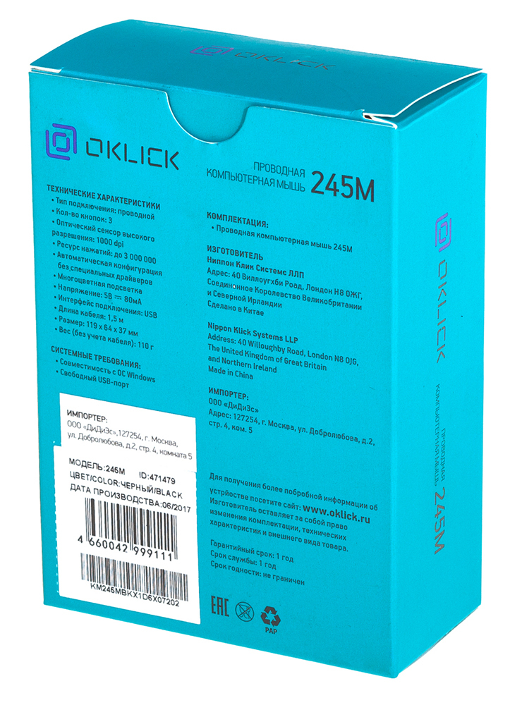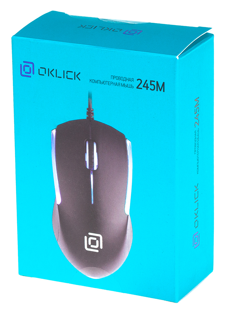 Характеристики Устройство относится к оптическому виду, имеет проводное соединение с ПК через разъем USB. Сенсор мыши OKLICK 245M обладает разрешением 1000 dpi. Автоматическая конфигурация не требует установки драйверов.
