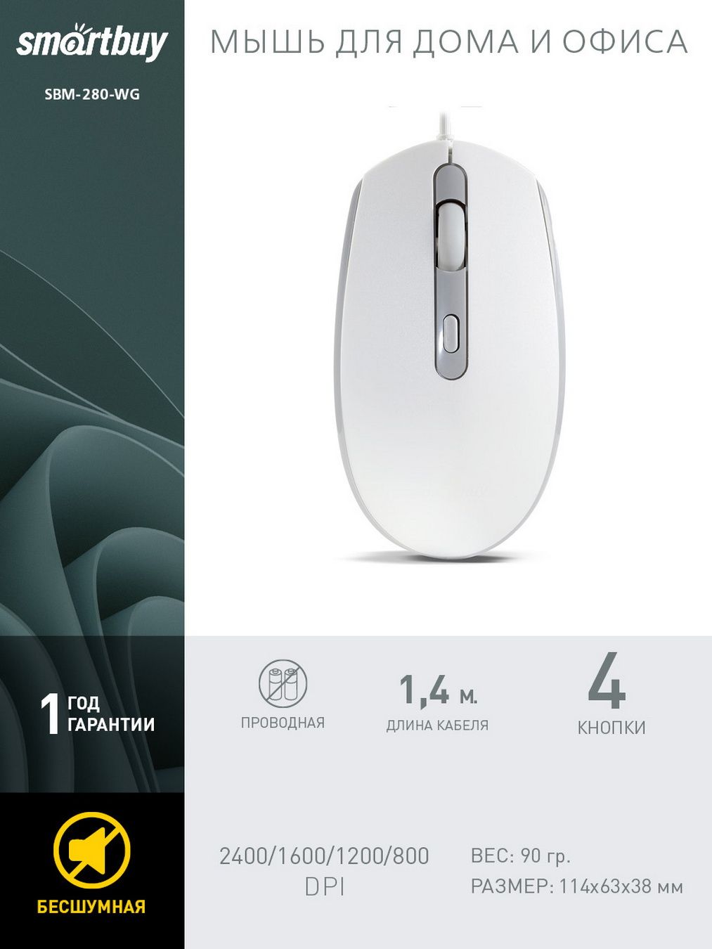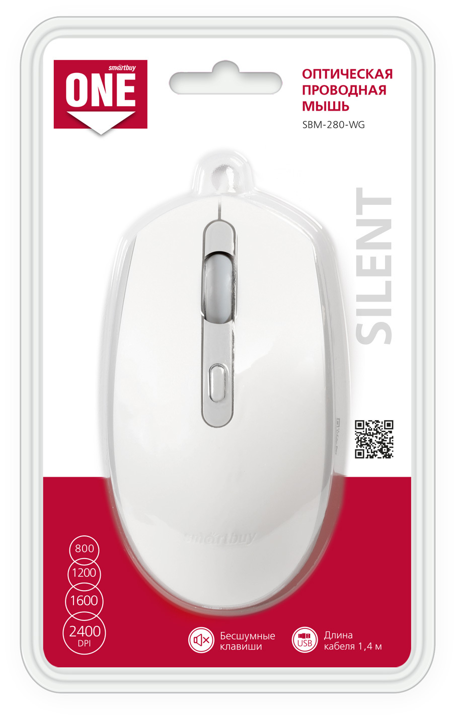 Мышь проводная бесшумная Smartbuy ONE 280 (SBM-280-WG), бело-серый
