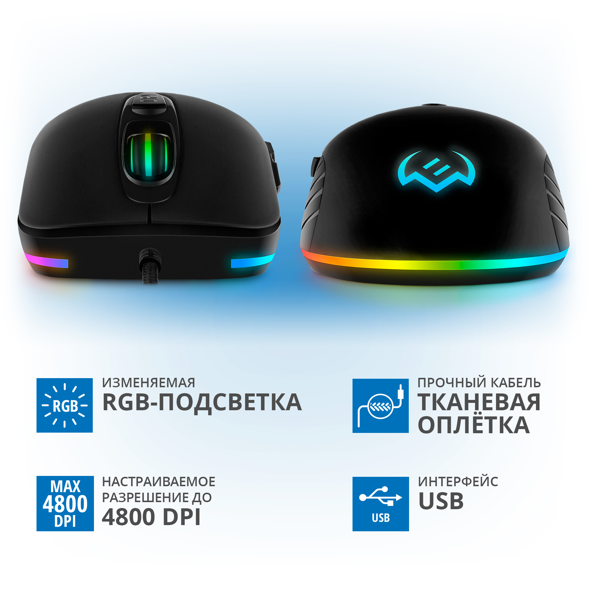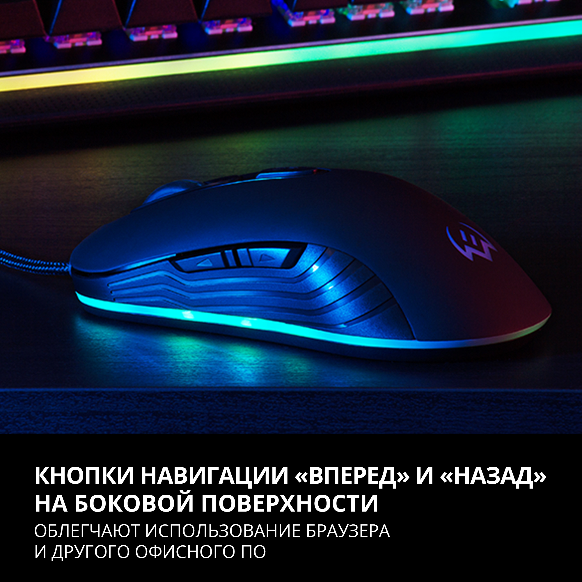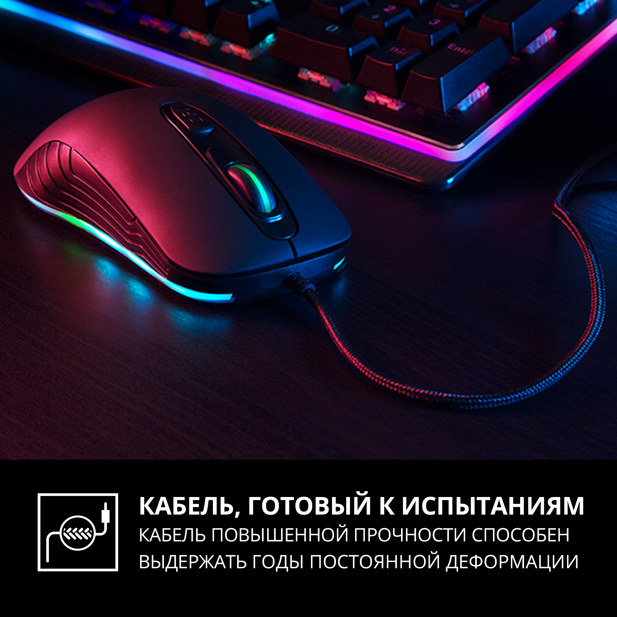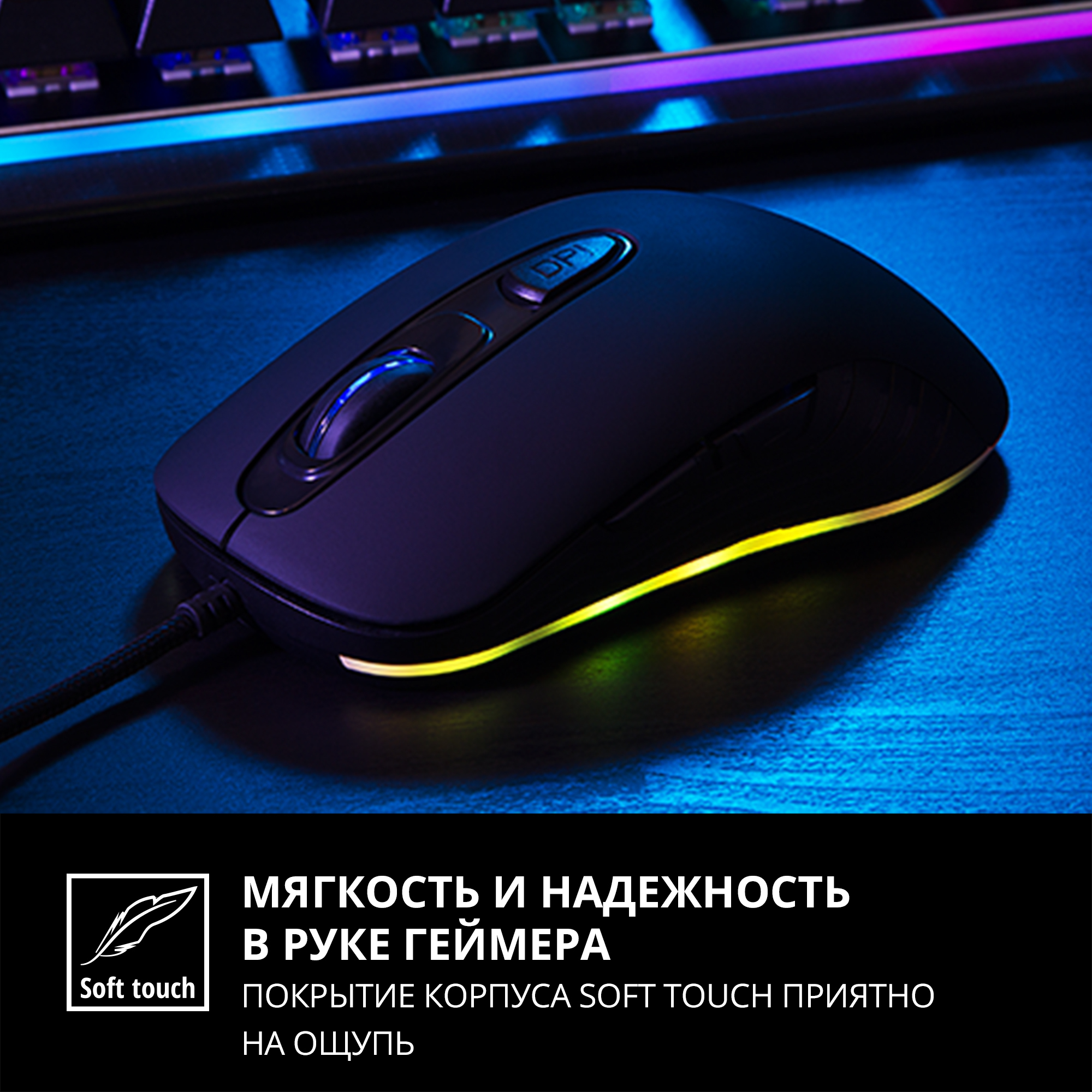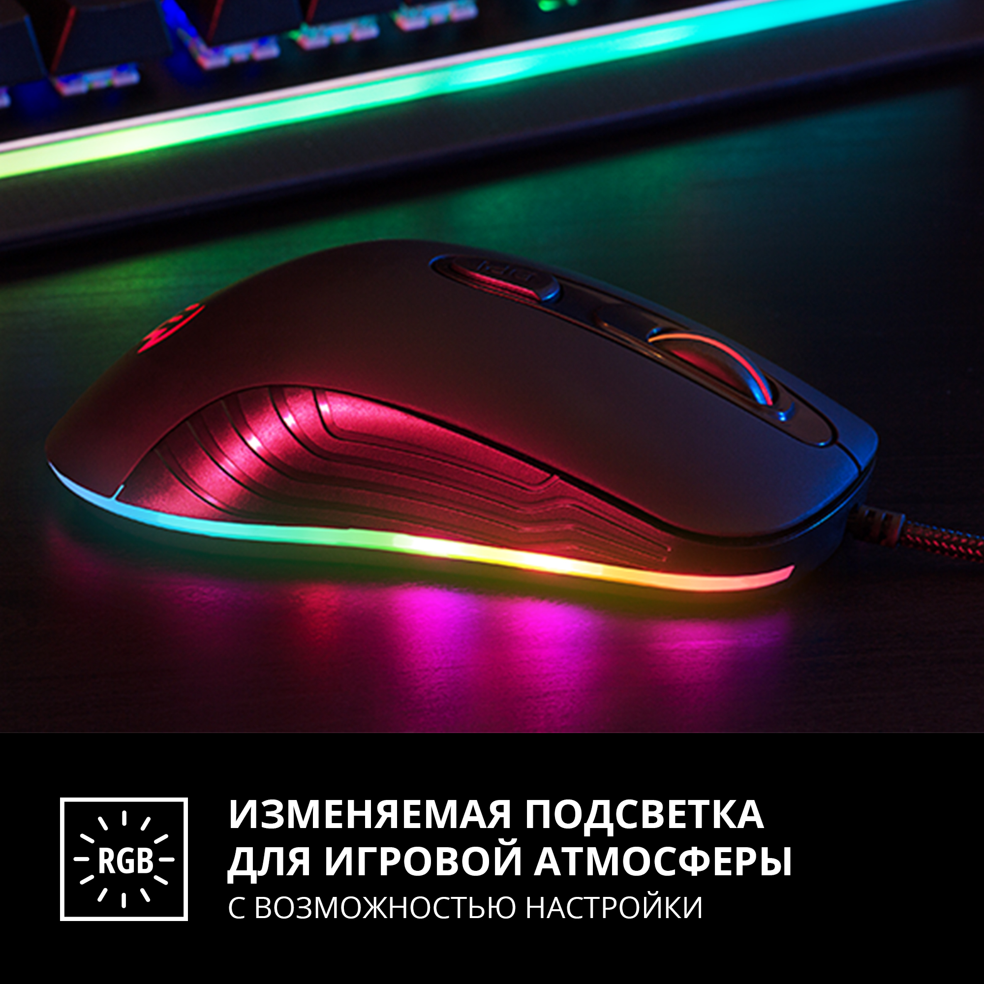 Описание: Текст при отключенной в браузере загрузке изображенийСкорость и эффективность в каждой клавишеСпециальное программное обеспечение позволяет изменять функции клавиш, а также создавать макросы, поднимающие комфорт и эффективность игрового процесса на новый уровень.Текст при отключенной в браузере загрузке изображенийФеерия цвета для захватывающего геймингаРазмещенная в корпусе мыши RGB-подсветка поддерживает несколько режимов, которые можно выбрать в соответствии со своими вкусами и создаваемой игрой атмосферой. Кнопка управления подсветкой, расположенная на нижней части мыши, дает возможность быстро изменять ее режимы без запуска ПО для настройки.Текст при отключенной в браузере загрузке изображенийИдеальный баланс скорости и точностиМышь поддерживает настраиваемое разрешение до 4800 DPI, смена режимов осуществляется с помощью специальной кнопки — в любой момент можете подобрать нужное соотношение скорости и точности перемещения в соответствии с игровой ситуацией.Текст при отключенной в браузере загрузке изображенийВперед и назад с легкостьюДополнительные боковые кнопки «вперед» и «назад» делают навигацию в играх, браузере и других приложениях быстрой и удобной.Текст при отключенной в браузере загрузке изображенийКабель, готовый к испытаниямТканевая оплетка кабеля помогает предотвратить запутывание и обеспечивает выполнение высоких требований профессиональных геймеров к его надежности.Текст при отключенной в браузере загрузке изображенийМягкость и надежность в руке геймераПокрытие корпуса Soft Touch крайне приятно на ощупь и позволяет крепко удерживать мышь даже в самые экстремальные игровые моменты.