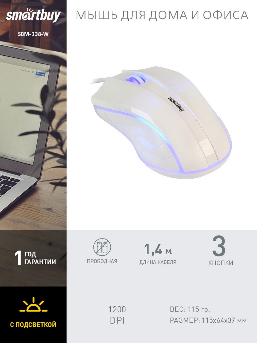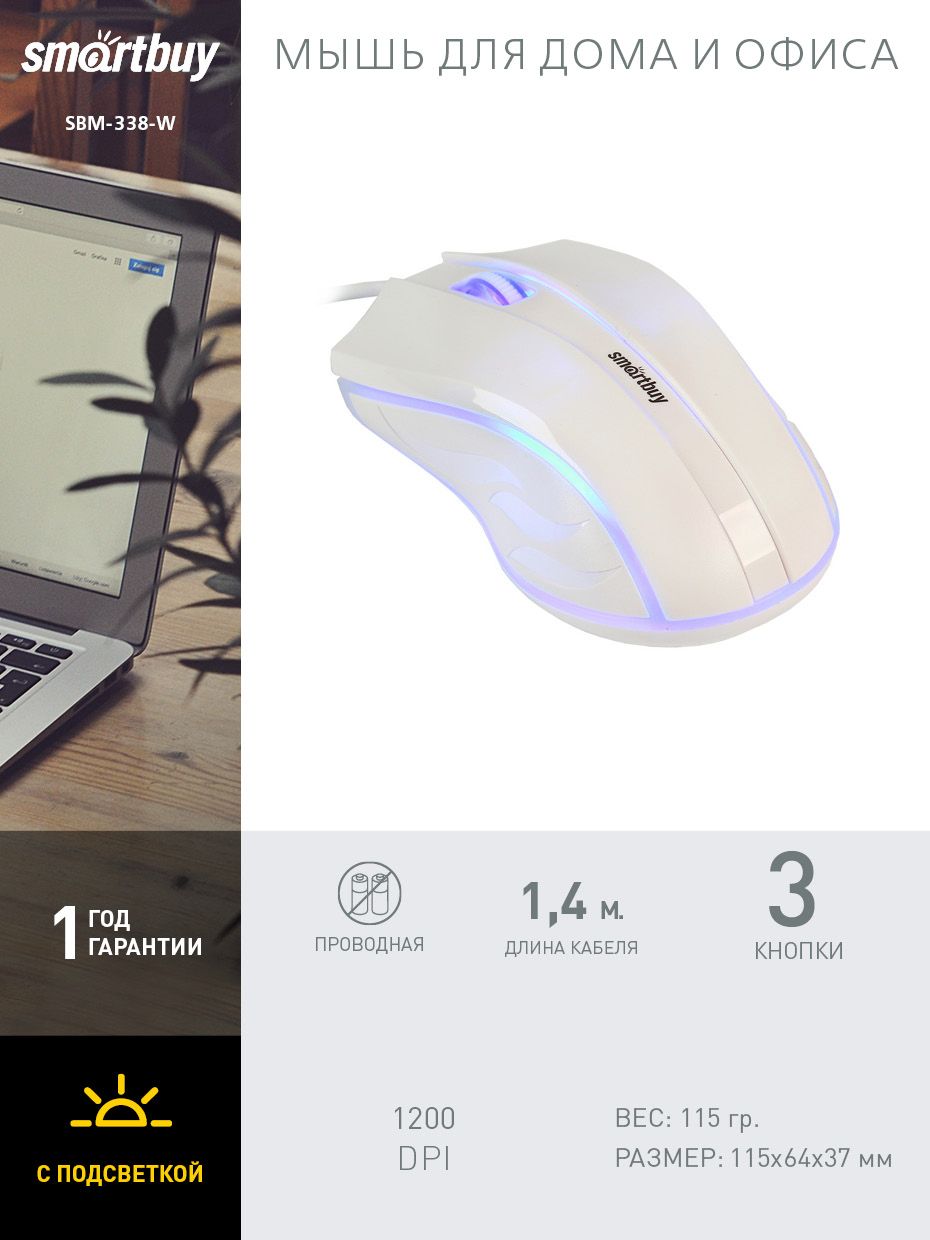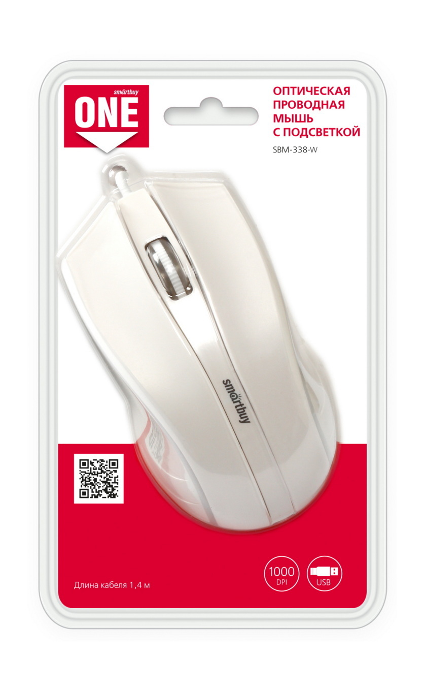 Мышь проводная с подсветкой Smartbuy ONE 338 (SBM-338-W), белый
