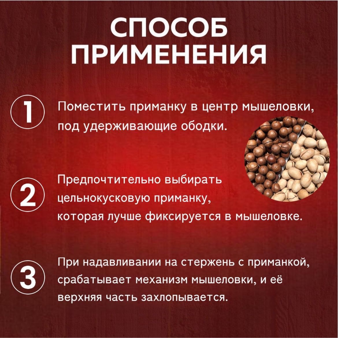 • Поместить приманку в центр мышеловки, под удерживающие ободки.