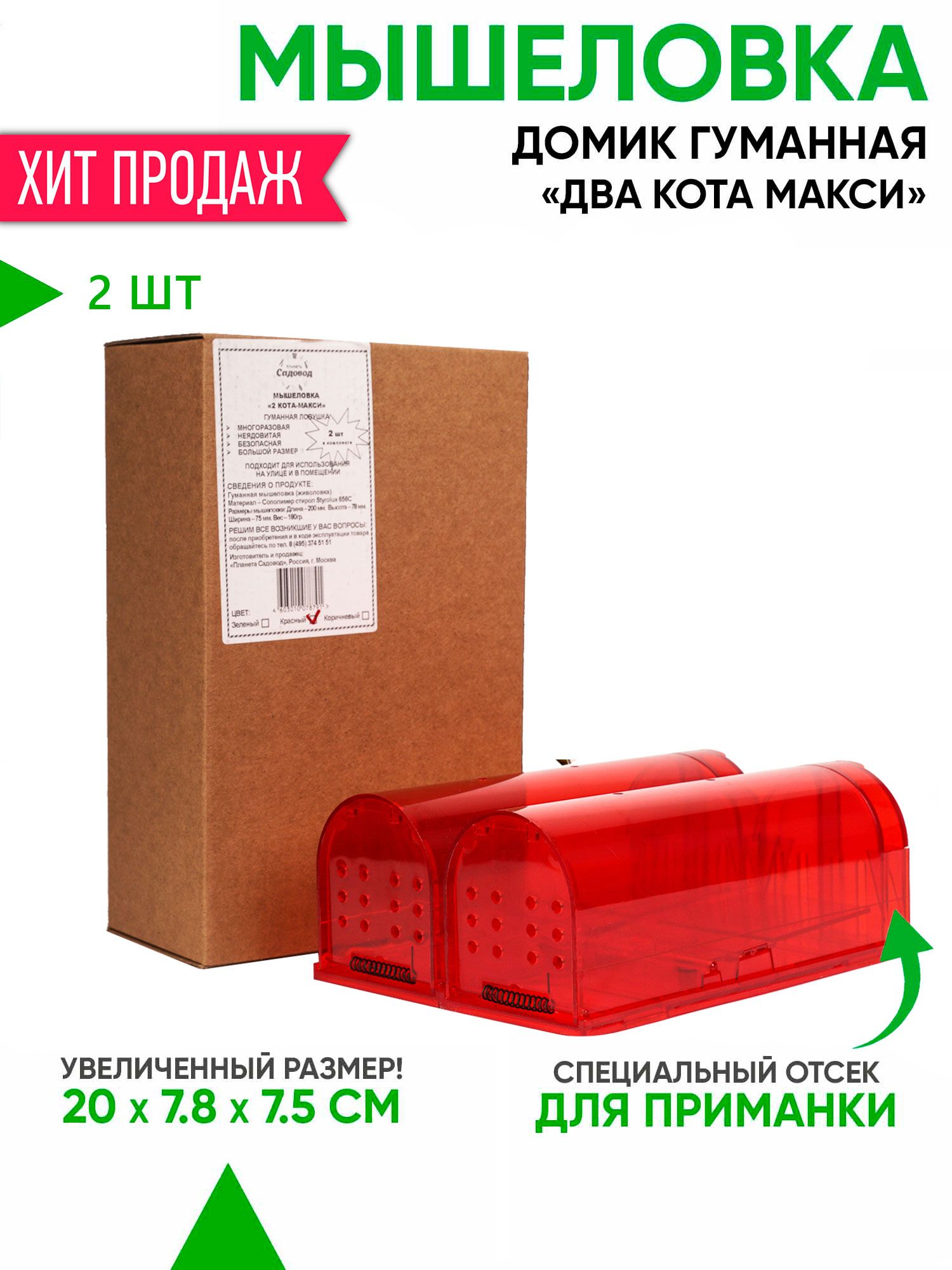 (красные, гуманные ловушки для мышей)Комплект Два Кота Макси – это специальные механические приспособления, которые можно использовать для отлова грызунов в любых жилых и рабочих помещениях. Подходят ловушки также для использования на складах, в больницах, на предприятиях, а также на улице. Вероятность улова увеличена в 2 раза: чтобы поймать одну-единственную мышь, установите сразу две ловушки, и в одну из них точно попадется любопытная незваная гостья!)