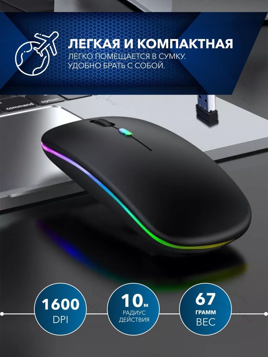 Описание: Мышь беспроводная ее стильный, эргономичный дизайн, качественно выделяют данный аксессуар среди конкурентов. Мышка для компьютера прекрасный выбор для работы, учебы и игр. Мышь беспроводная оптическая – компактная, тихая и эргономичная, обладает ярким оригинальным дизайном. Мышь компьютерная подходит для использования как в левой, так и в правой руке. Мышка беспроводная подходит к любому компьютеру или ноутбуку. Мышка благодаря небольшим размерам, легко поместится в сумке. Беспроводная мышь из прочного, приятного на ощупь пластика обеспечивающий надежную защиту и комфорт в ежедневной эксплуатации. Компьютерная мышь благодаря беспроводной связи позволяет использовать устройство в радиусе до 10 метров от подключенного к USB порту приемника, который имеет минимальные размеры. Мышь может работать при полной зарядке 168 часов с подсветкой. Компьютерная мышь беспроводная может заряжаться с любого устройства - ноутбук, компьютер, пауэр-банк, максимальное время зарядки: 2 часа. Беспроводная мышка с подсветкой оснащена двумя классическими кнопками, колесиком, оптическим светодиодным сенсором с чувствительностью 1600 dpi. Компьютерная мышка внутри имеет перезаряжаемый литиевый аккумулятор. Мышь беспроводная для ноутбука - функциональная плоская мышь с удобными кнопками, не нуждается в использовании переходников, адаптеров. Благодаря лазерной технологии, мышка компьютерная беспроводная превосходно работает на любых поверхностях. Мышь для компьютера обеспечивает точное и плавное перемещение курсора и не нуждается в дополнительном использовании настольных ковриков. Мышь компьютерная беспроводная идет в комплектации: 1) мышка компьютерная с USB адаптером, 2) микро USB кабель (для подзарядки). Мышка для компьютера беспроводная, совместима с любой операционной системой: Windows, Mac OS, Android, iPad OS. Мышка беспроводная компьютерная, избавит от громких кликов, обеспечит спокойную работу в тишине дома и на работе. Мышка компьютерная беспроводная невероятно тихая, беззвучная и компактная, придется по вкусу ценителям эстетики. Мышка для ноутбука, бесшумная мышь - стильный девайс для комфортной работы с компьютерной техникой. Мышка компьютерная беспроводная, мышь с подсветкой используется как мышь для ноутбука, мышка для пк. Мышки (для компьютера) отличный подарок, как геймеру, так и офисному работнику. У нас представлены беспроводные мышки разных цветов. Выбирайте цвет на свой вкус.