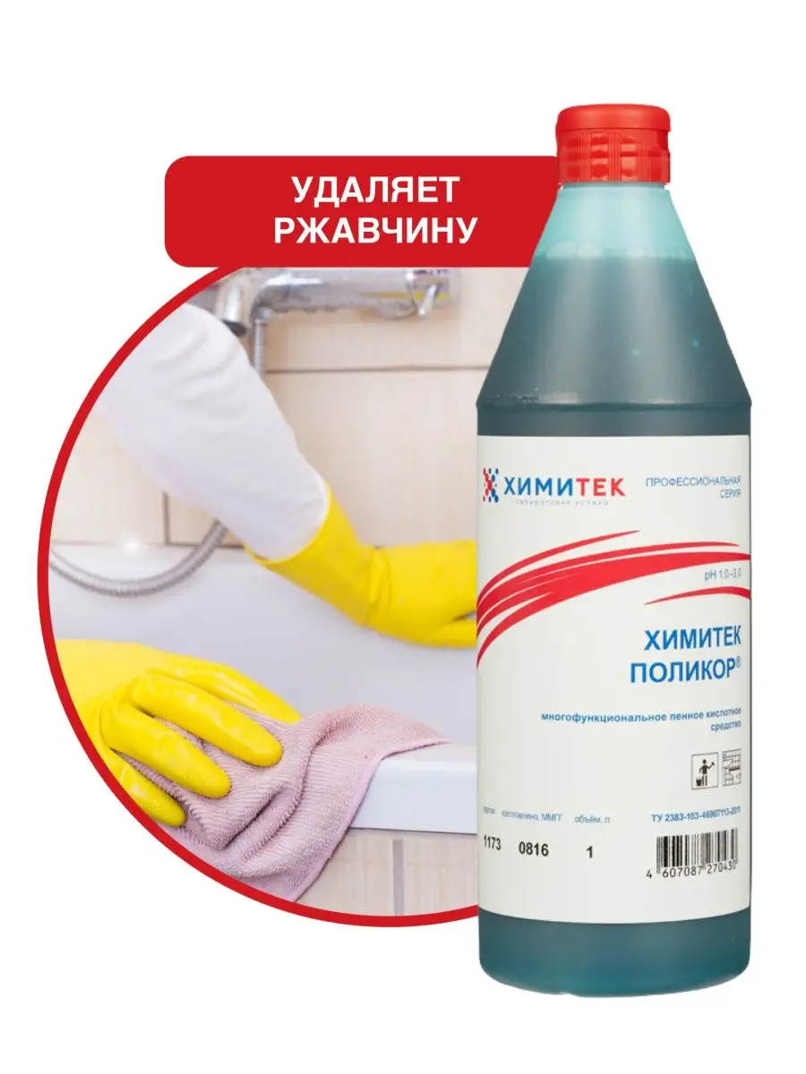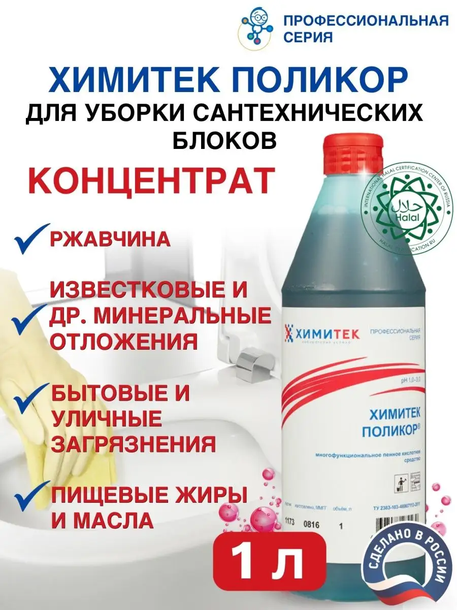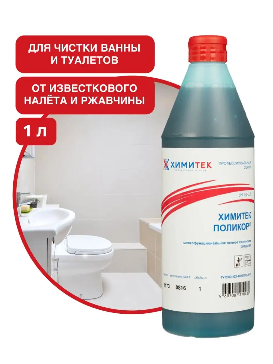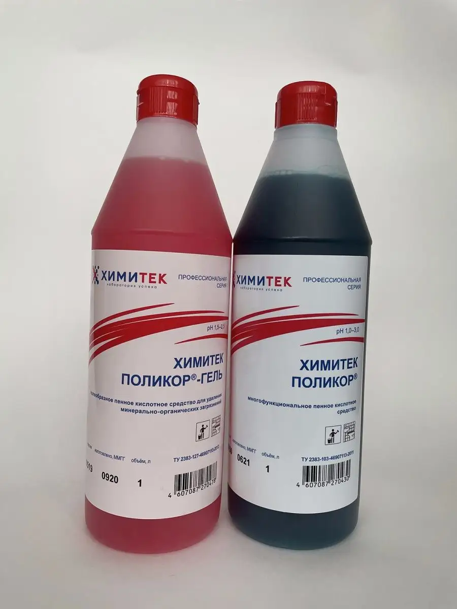 Описание: Набор гипоаллергенных чистящих средств (без фосфатов и силикатов) для ванной комнаты и туалета бренда Химитек объёмом по 1л каждый с приятными запахами (не едкими!). Подходит для чистки:- любых ванн (акриловая, стальная, чугунная), душевых кабин (идеально очищает капли, подтёки воды на дверцах), санфаянсовые поверхности (унитаз, туалет) - Химитек Поликор (синий концентрат) отлично удаляет ржавчину, подтёки воды), также обладает противомикробным (антибактериальным) эффектом, хромированные поверхности до блеска чистит Химитек Поликор-Гель (розовый концентрат), т.к. содержит ортофосфорную кислоту. Средства не содержат соляную кислоту, силикатов, фосфатов, хлора, спирта. 1. ХИМИТЕК ПОЛИКОР - ГЕЛЬ розовый 1литр - концентрированное гелеобразное пенное кислотное средство для удаления минерально-органических загрязнений для очистки кафельных, керамических, фаянсовых, акриловых, полимерных, хромированных, гранитных, металлических, эмалированных и др. поверхностей. Рекомендуется для комплексной уборки сантехнических блоков. Одностадийно удаляет органические загрязнения и минеральные отложения. Средство используют без разведения. Равномерно распределить по влажной поверхности с помощью губки или щётки, через 1–5 минут смыть водой. Химитек гель розовый содержит ортофосфорную кислоту, а ХИМИТЕК ПОЛИКОР гель синего цвета 1л - щавелевую. 2. Химитек Поликор зелёный - многофункциональное концентрированное жидкое пенное кислотное средство для мытья кафельных, керамических, фаянсовых, гранитных, полимерных и других кислотостойких поверхностей. Удаляет ржавчину, известковые, бытовые и уличные загрязнения. Обладает антимикробным эффектом. Рекомендуется для мытья сантехнических блоков. Не использовать на хромированных поверхностях!!! Средство используется в виде концентрата или 1–10% рабочих растворов в зависимости от степени и характера загрязнений. Для удаления ржавчины и стойких минеральных отложений допускается использование средства без разведения, время экспозиции 5–15 минут.