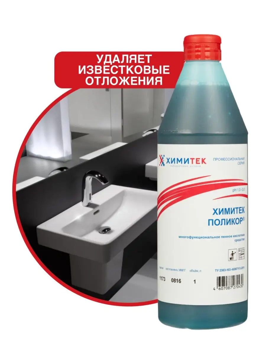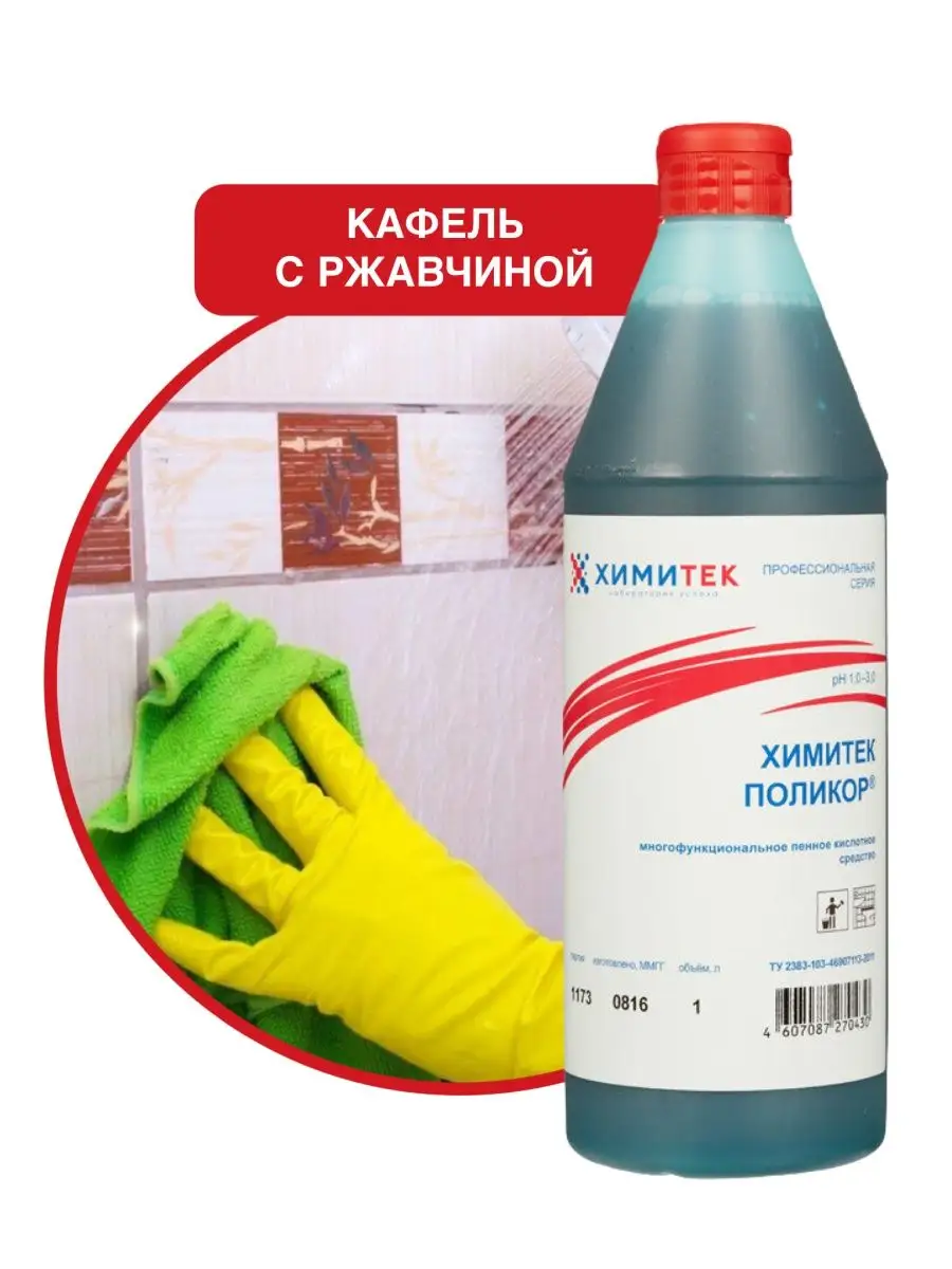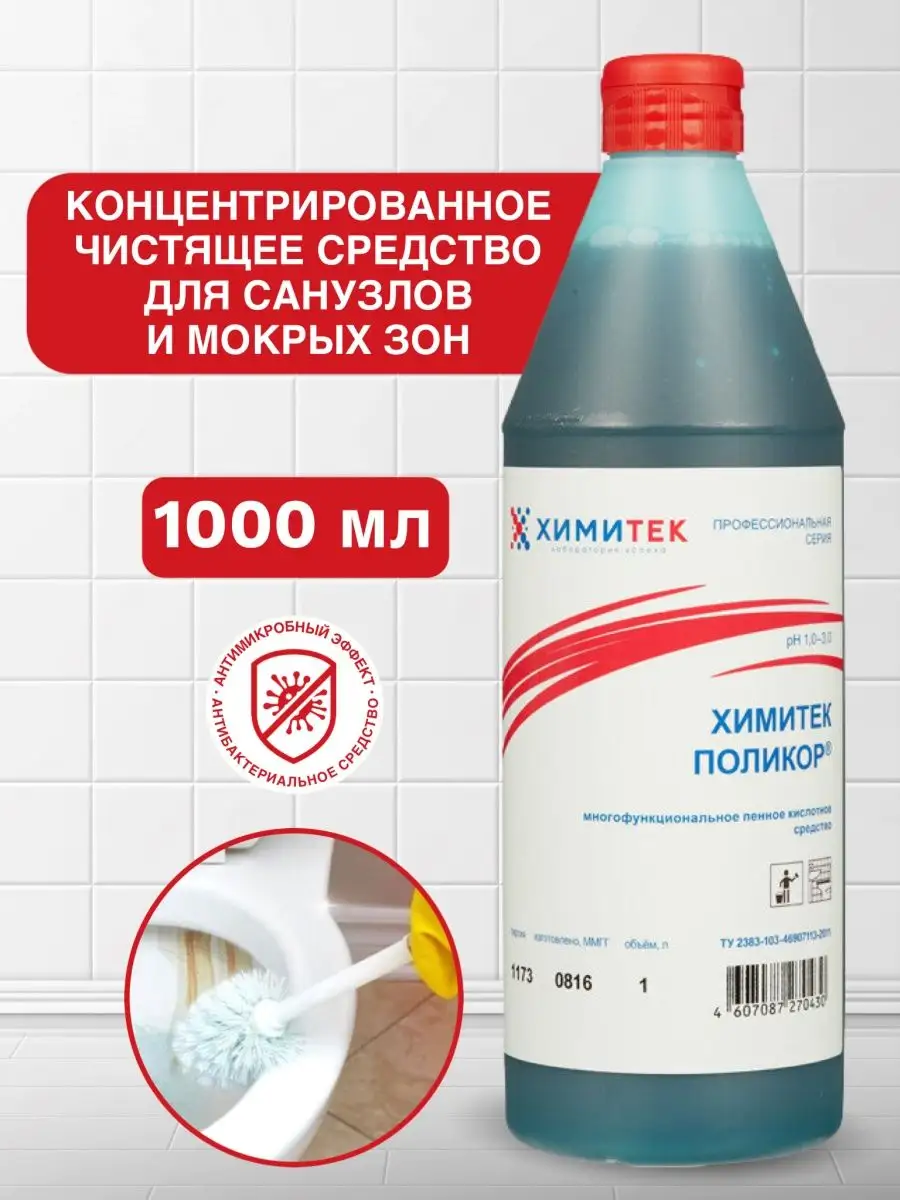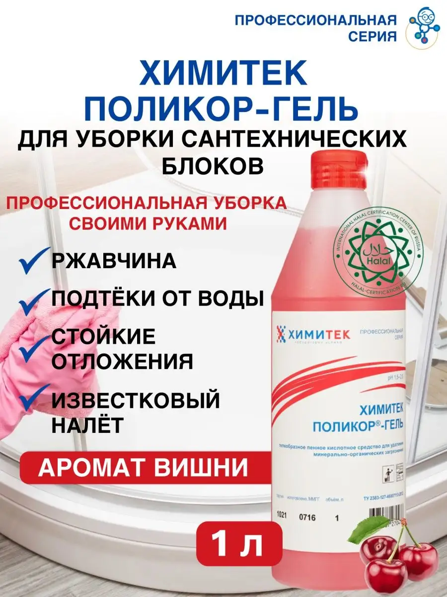 Описание: Набор гипоаллергенных чистящих средств (без фосфатов и силикатов) для ванной комнаты и туалета бренда Химитек объёмом по 1л каждый с приятными запахами (не едкими!). Подходит для чистки:- любых ванн (акриловая, стальная, чугунная), душевых кабин (идеально очищает капли, подтёки воды на дверцах), санфаянсовые поверхности (унитаз, туалет) - Химитек Поликор (синий концентрат) отлично удаляет ржавчину, подтёки воды), также обладает противомикробным (антибактериальным) эффектом, хромированные поверхности до блеска чистит Химитек Поликор-Гель (розовый концентрат), т.к. содержит ортофосфорную кислоту. Средства не содержат соляную кислоту, силикатов, фосфатов, хлора, спирта. 1. ХИМИТЕК ПОЛИКОР - ГЕЛЬ розовый 1литр - концентрированное гелеобразное пенное кислотное средство для удаления минерально-органических загрязнений для очистки кафельных, керамических, фаянсовых, акриловых, полимерных, хромированных, гранитных, металлических, эмалированных и др. поверхностей. Рекомендуется для комплексной уборки сантехнических блоков. Одностадийно удаляет органические загрязнения и минеральные отложения. Средство используют без разведения. Равномерно распределить по влажной поверхности с помощью губки или щётки, через 1–5 минут смыть водой. Химитек гель розовый содержит ортофосфорную кислоту, а ХИМИТЕК ПОЛИКОР гель синего цвета 1л - щавелевую. 2. Химитек Поликор зелёный - многофункциональное концентрированное жидкое пенное кислотное средство для мытья кафельных, керамических, фаянсовых, гранитных, полимерных и других кислотостойких поверхностей. Удаляет ржавчину, известковые, бытовые и уличные загрязнения. Обладает антимикробным эффектом. Рекомендуется для мытья сантехнических блоков. Не использовать на хромированных поверхностях!!! Средство используется в виде концентрата или 1–10% рабочих растворов в зависимости от степени и характера загрязнений. Для удаления ржавчины и стойких минеральных отложений допускается использование средства без разведения, время экспозиции 5–15 минут.