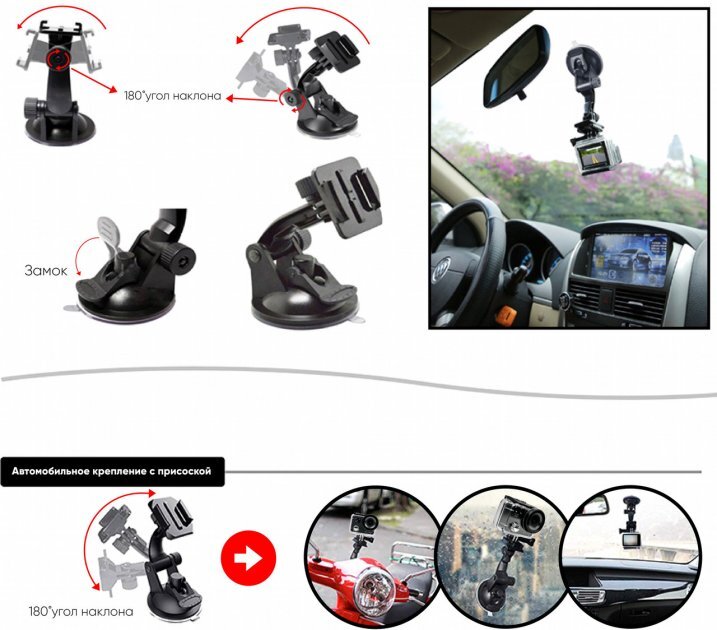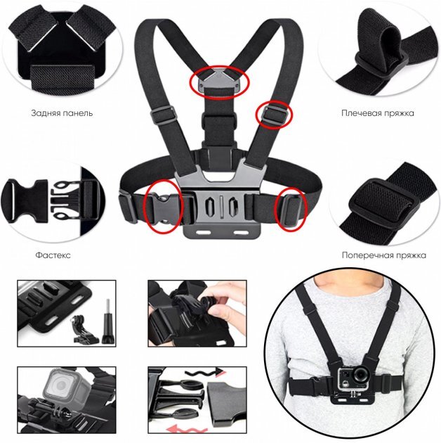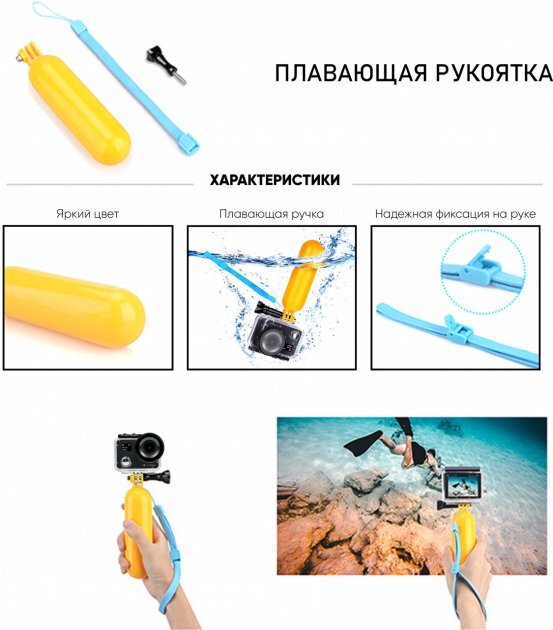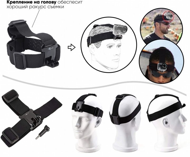 Крепление на голову – 1 шт; Крепление на грудь – 1 шт; Монопод с адаптером – 1 шт; Поплавок с ремешком и винтом - 1 шт; J-крючок с пряжкой – 2 шт; Крепление защелка – 2 шт; Застежка на липучке на руку – 1 шт; Болт для крепления (длинный) – 3 шт; Болт для крепления (короткий) – 1 шт; Поворотное крепление переходник (длинное) – 1 шт; Поворотное крепление переходник (короткое) – 1 шт; Универсальное крепление на резьбу или наклейку (круглое, плоское) – 2 шт; Крепление присоска на стекло – 1 шт; Тканевый чехол – 1 шт.