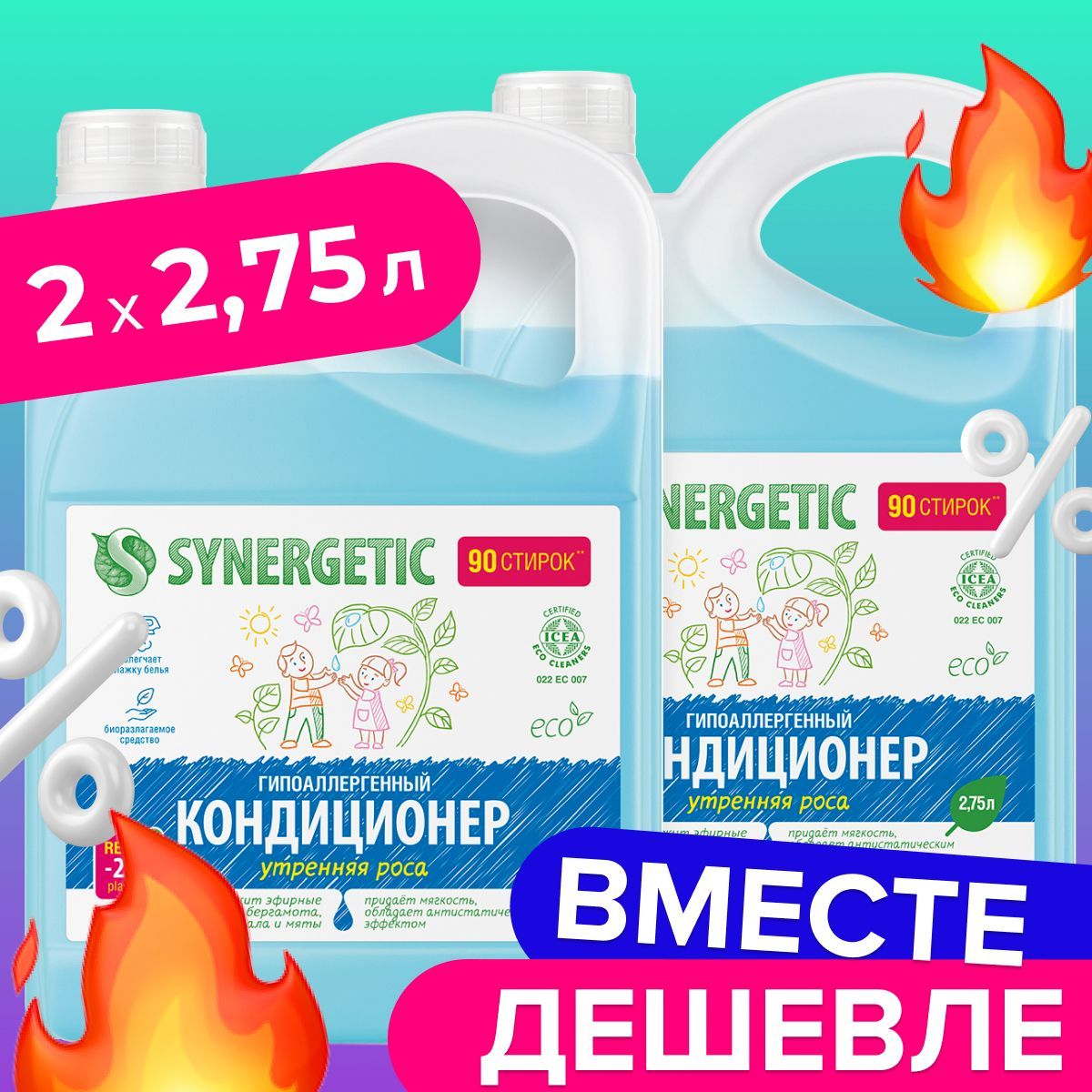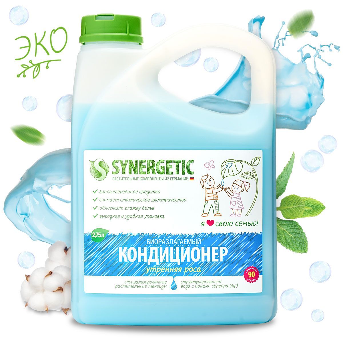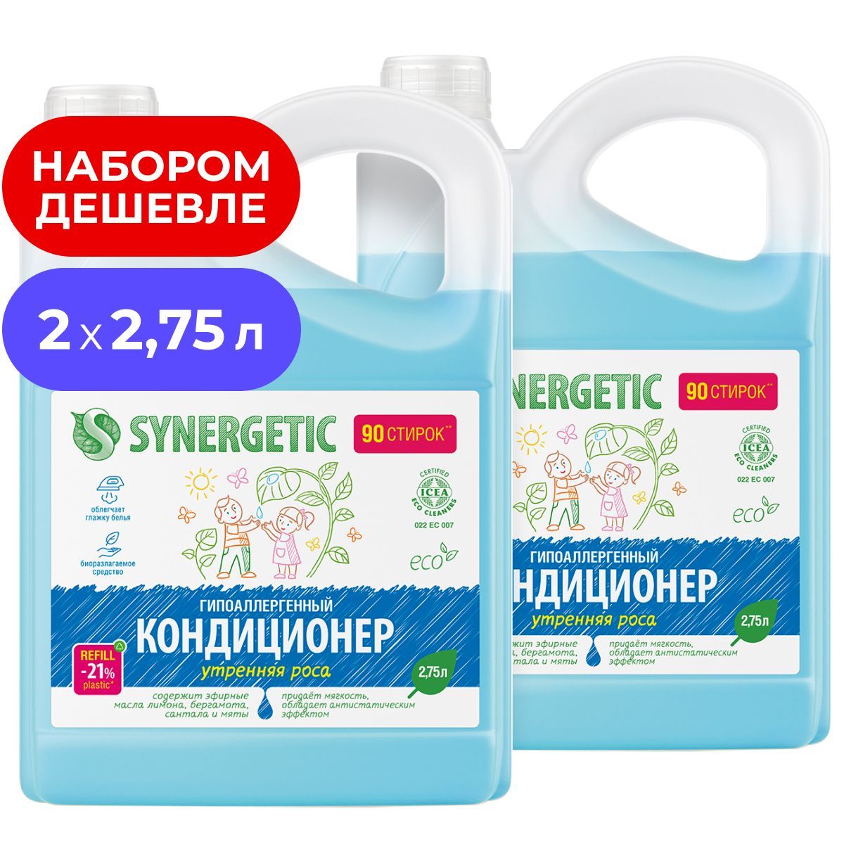 Набор Биоразлагаемый кондиционер-ополаскиватель для белья SYNERGETIC: утренняя роса, 2,75л.