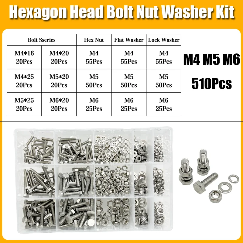 Набор болтов и гаек M4 M5 M6, 510 шт